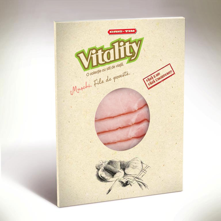 Gama Vitality cuprinde 5 sortimente: bacon, sunca de curcan, muschi file, carnati semiafumati si salam. Ele pot fi identificate cu usurinta datorita ambalajului.