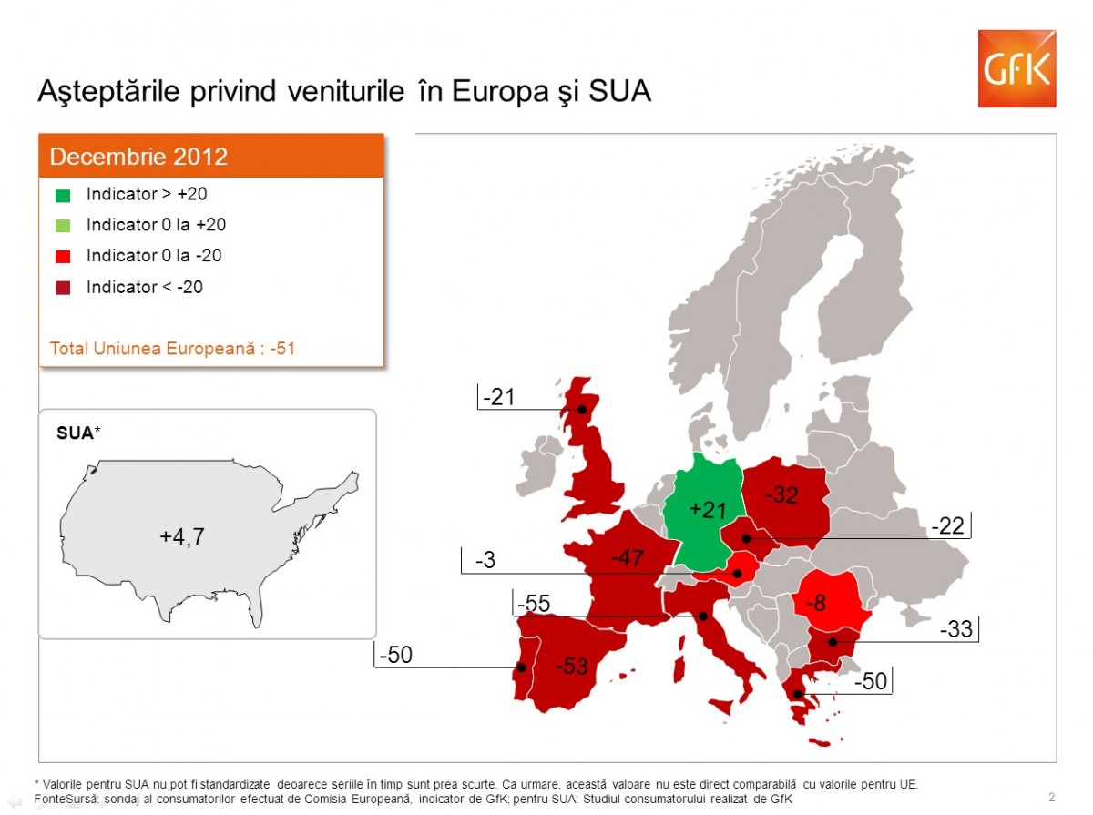 Tot la nivelul Europei, in decembrie, dorinta de cumparare se situa la 20,1 puncte in Germania. Indicatorul inregistra de asemenea o valoare pozitiva in Austria (16,7 puncte) si Bulgaria (5,7 puncte). Romania se afla pe locul 4, cu -24,2 puncte, fata de -25,2 puncte in T3 2012. In schimb, Italia (-38,0 puncte), Portugalia (-46,9 puncte) si Regatul Unit (-47,2 puncte) au cele mai slabe valori in ceea ce priveste dorinta de cumparare.