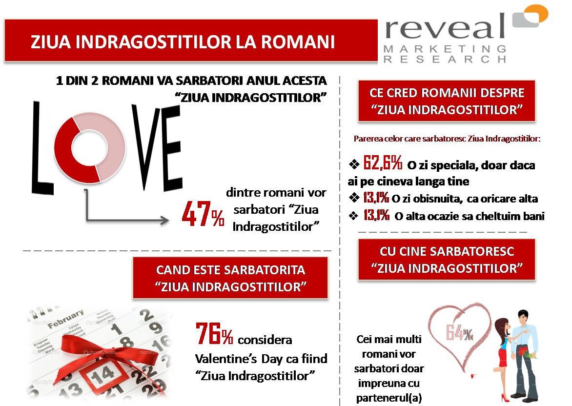 Un studiu derulat de Reveal Marketing Research cu privire la atitudinea romanilor fata de Valenine’s Day arata ca 47% dintre romani vor sarbatori Ziua Indragostitilor, iar 76% acorda valente de sarbatoare a dragostei zilei de 14 februarie. Mai mult, din randul celor care sarbatoresc Ziua Indragostitilor, 62.6% considera ca este o zi speciala doar daca au un partener alaturi, 13.1% considera ca este o zi ca oricare alta, iar 13.1% ca e o alta ocazie de a cheltui bani, informeaza un comunicat emis de compania de cercetare.