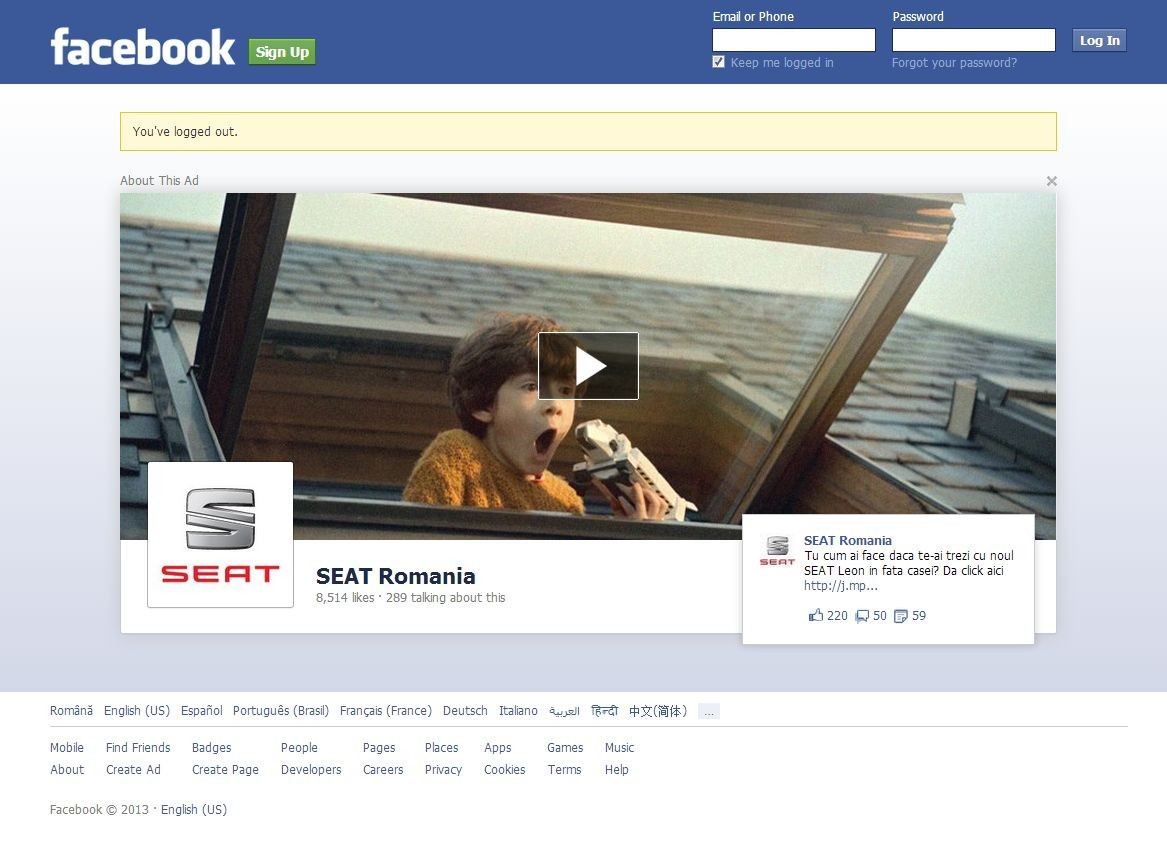 Pe parcursul acestei zile, promovarea aplicatiei se face prin formatul LOX (Log-Out Experience), care vizeaza userii care se delogheaza de pe Facebook la finalul sesiunii. SEAT este primul brand din categoria auto care utilizeaza aceasta facilitate, precizeaza Thinkdigital Romania.