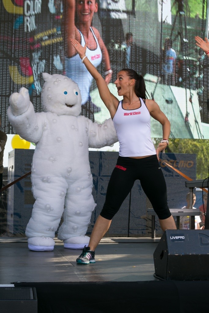 Clabucel, mascota brandului a fost si el prezent pe tot parcursul cursei: si-a facut incalzirea alaturi de antrenorii de la World Class, a dat startul curselor cu o explozie de prospetime si i-a asteptat pe alergatori la punctul de finis.