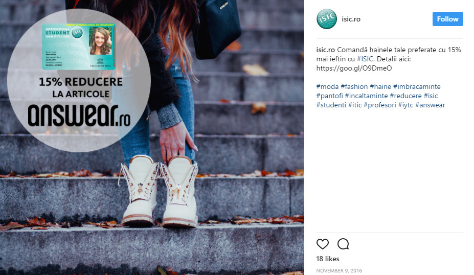 Apoi, internationalitatea. Beneficiezi de reducerile special create pentru tineri in celelalte tari. La nivel international avem peste 126.000 de reduceri, iar in Romania sunt aproximativ 2000 de parteneri care au creat reduceri exclusive posesorilor de legitimatii ISIC.
