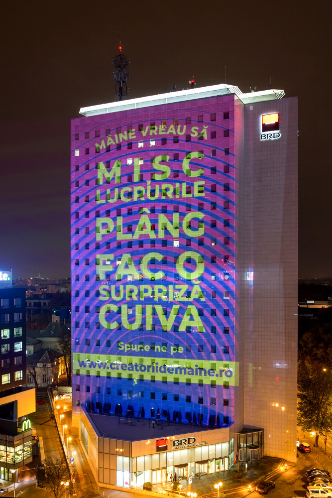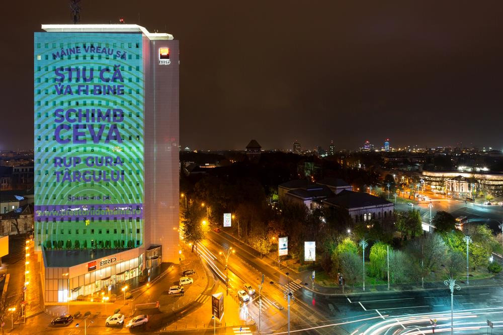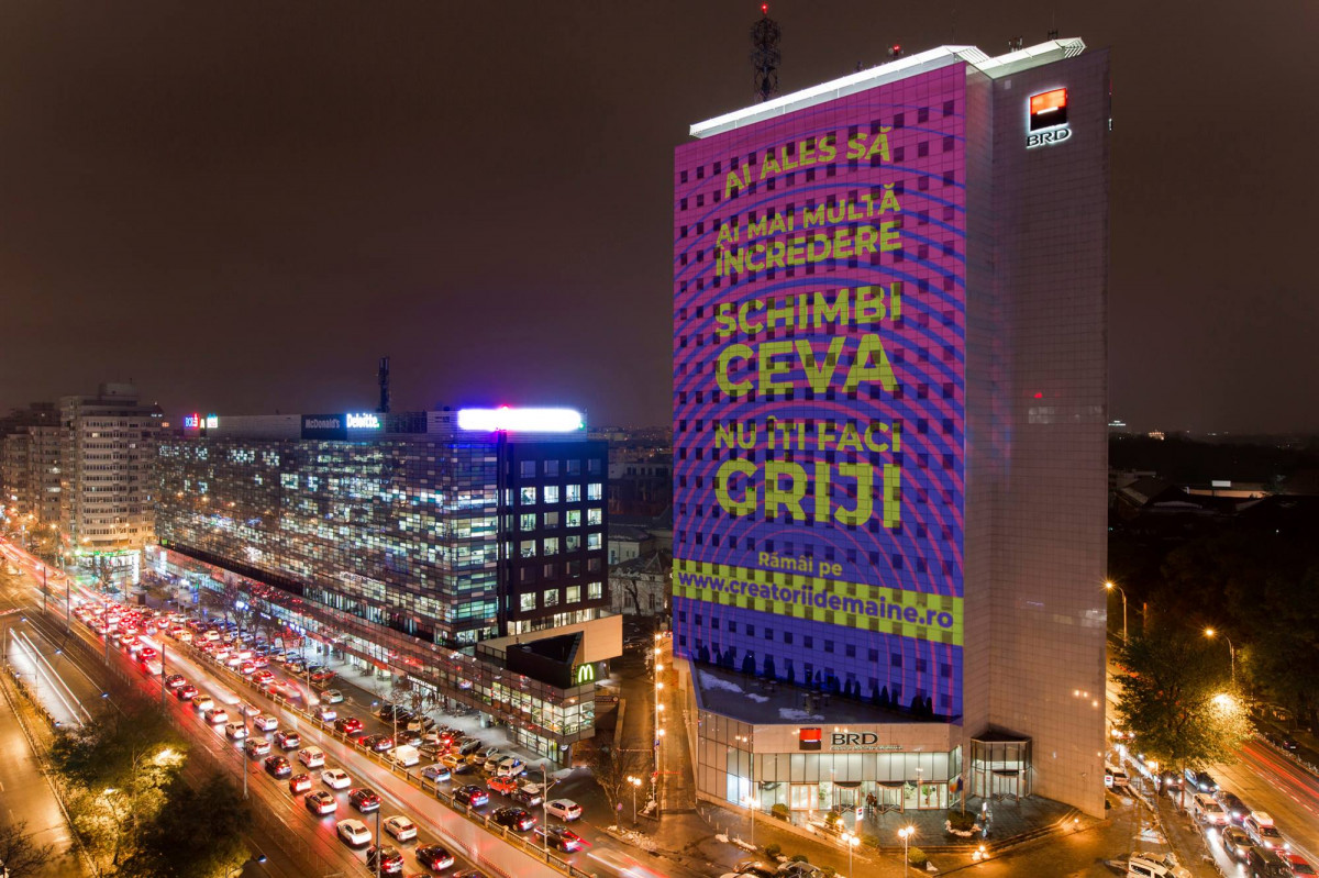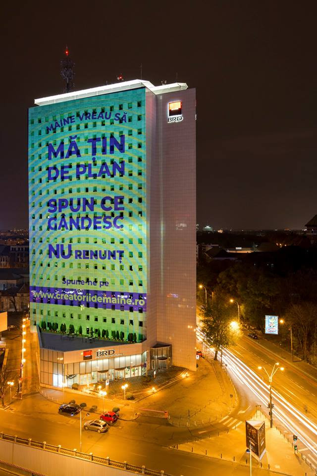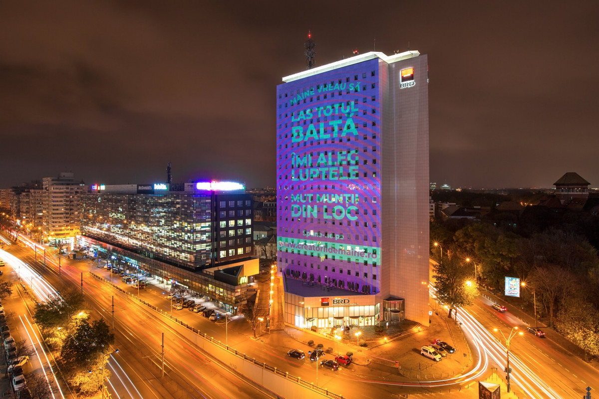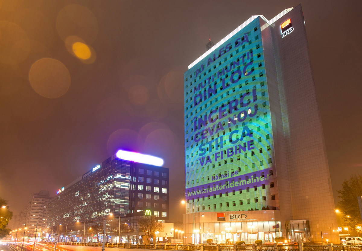 BRD – Groupe Société Générale marchează o nouă poziționare de brand a Société Générale, printr-o abordare unică la nivelul celor 67 țări în care grupul este prezent. Din 14 noiembrie, BRD deschide o conversație cu publicul despre pașii mici și mari pe care fiecare dintre noi îi parcurge zilnic pentru a-și îndeplini visul, printr-o serie de proiecții pani realizate pe sediul central, Turnul BRD. Publicul este invitat să se implice în conversație pe site-ul creatoriidemaine.ro.
