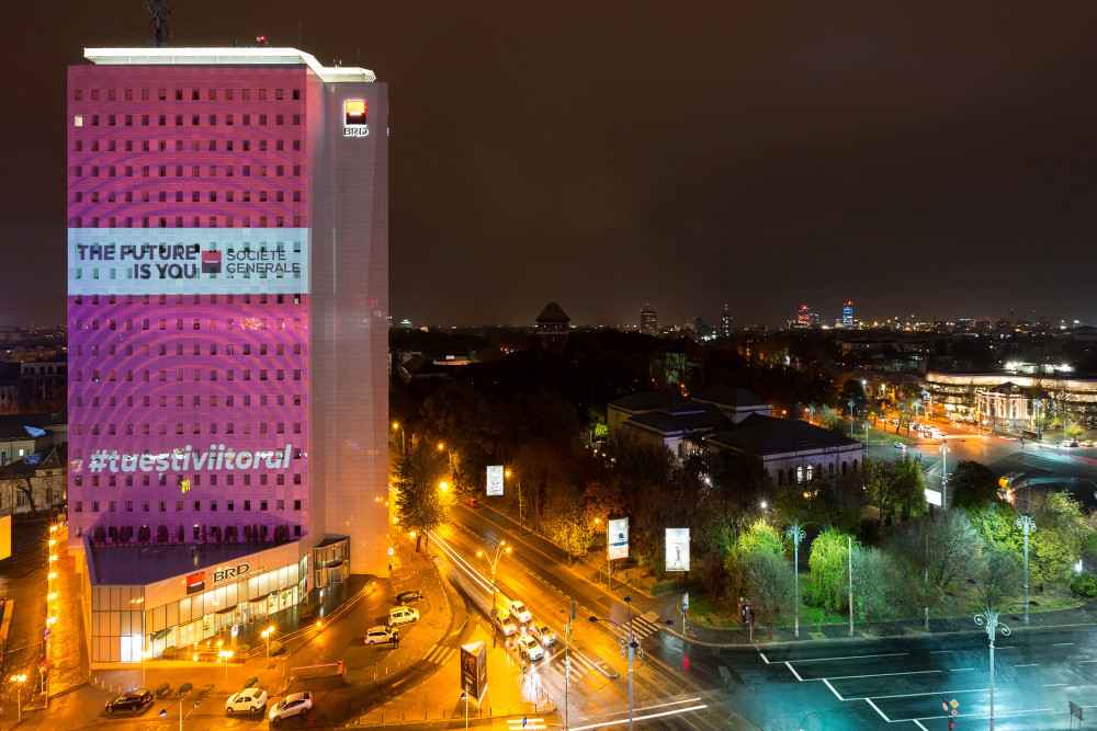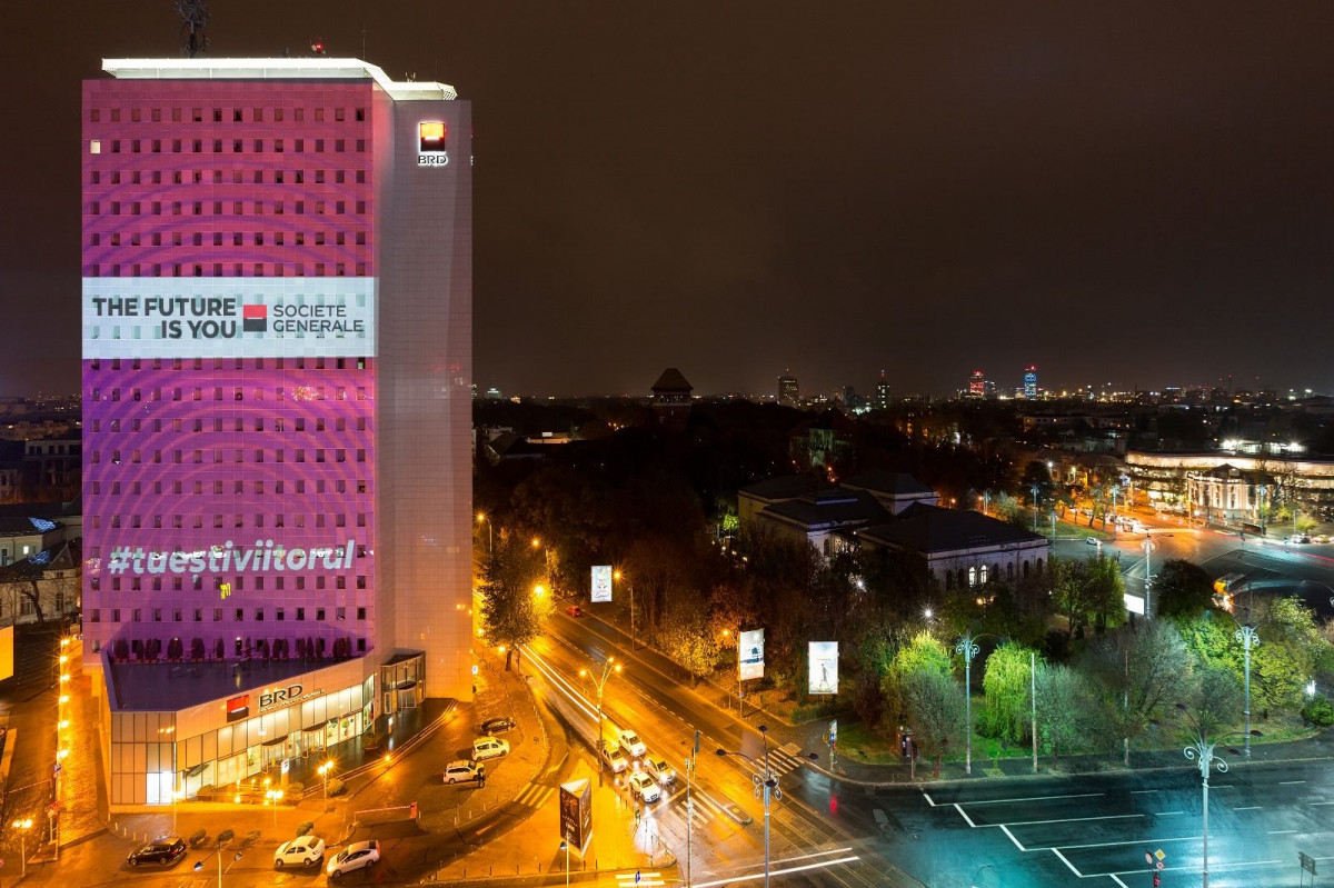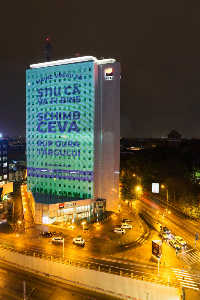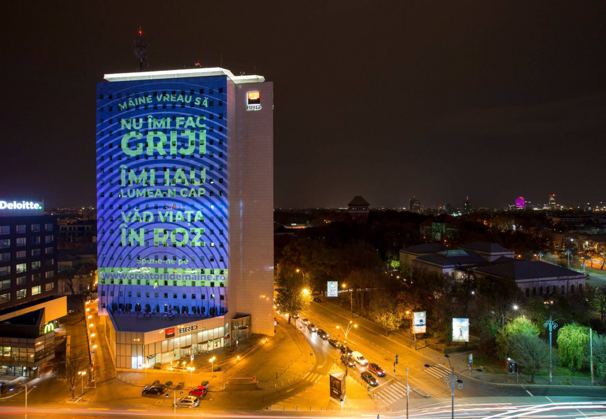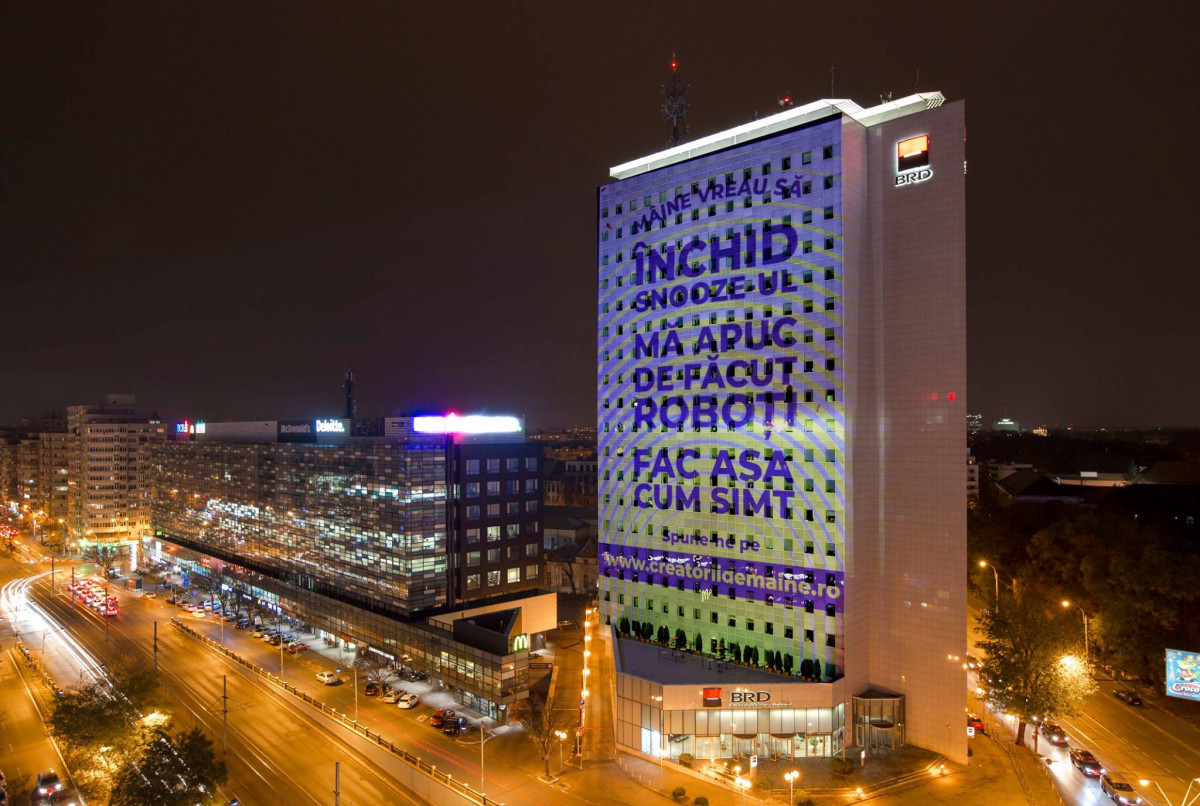 BRD – Groupe Société Générale marchează o nouă poziționare de brand a Société Générale, printr-o abordare unică la nivelul celor 67 țări în care grupul este prezent. Din 14 noiembrie, BRD deschide o conversație cu publicul despre pașii mici și mari pe care fiecare dintre noi îi parcurge zilnic pentru a-și îndeplini visul, printr-o serie de proiecții pani realizate pe sediul central, Turnul BRD. Publicul este invitat să se implice în conversație pe site-ul creatoriidemaine.ro.