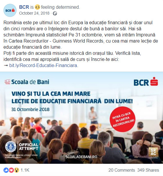 Pentru o sesiune de ateliere desfasurate simultan in 59 de locatii, la care au participat peste 13.000 de tineri, BCR a intrat in Cartea Recordurilor cu cea mai mare lectie de educatie financiara din lume, record detinut anterior de PriceWaterhouse Coopers (Statele Unite).