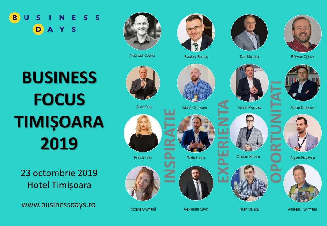 Business Days se întoarce la Timișoara cu un format special, o evoluție firească a anilor de dezvoltare prin care am trecut: Business Focus Timișoara, un eveniment care concentrează pe durata unei singure zile un program intens de dezvoltare profesionala și networking, cu o structură mult mai focusată și adaptată problemelor și nevoilor antreprenorilor, managerilor și directorilor de departamente. Aceștia vor fi expuși la cele mai noi informații și la schimburi de idei aplicate în domenii precum branding de angajator, leadership, inteligență emoțională, cultură organizațională modernă, delegare, inovație, tehnologizare și transformare digitală, motivare și implicare, managementul modern al performanței echipei și organizației.