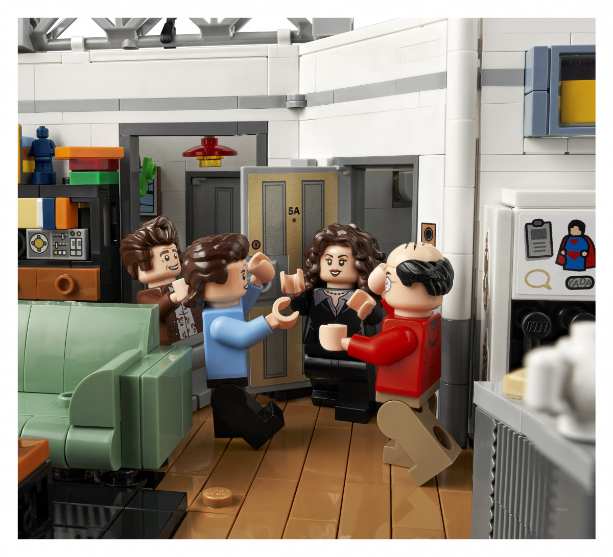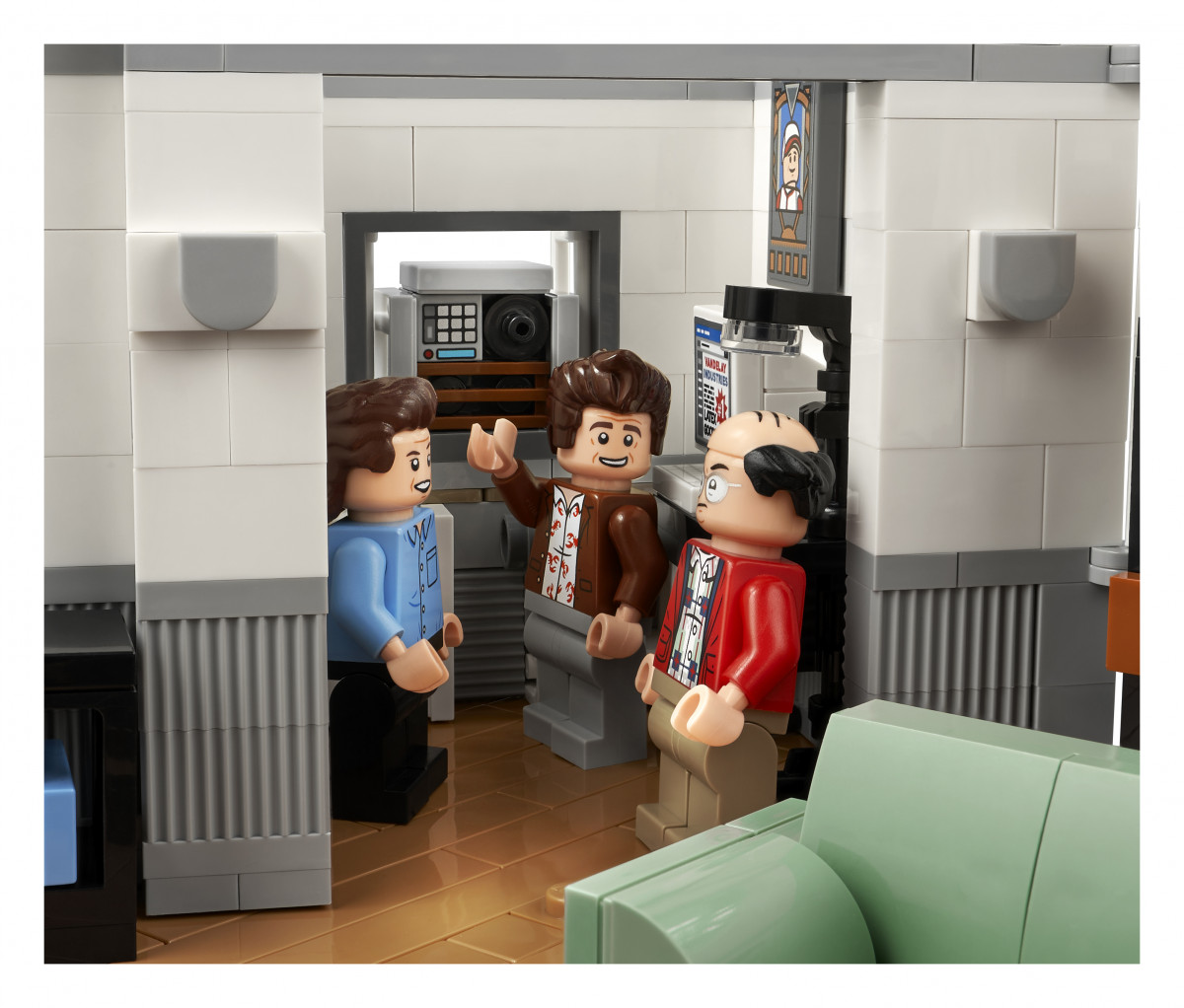 De asemenea, setul include 5 minifigurine inspirate de personajele principale și de poștașul din serial: Jerry Seinfeld, George Costanza, Cosmo Kramer, Elaine Benes și Newman, toți cu ținute specifice anilor ’90.