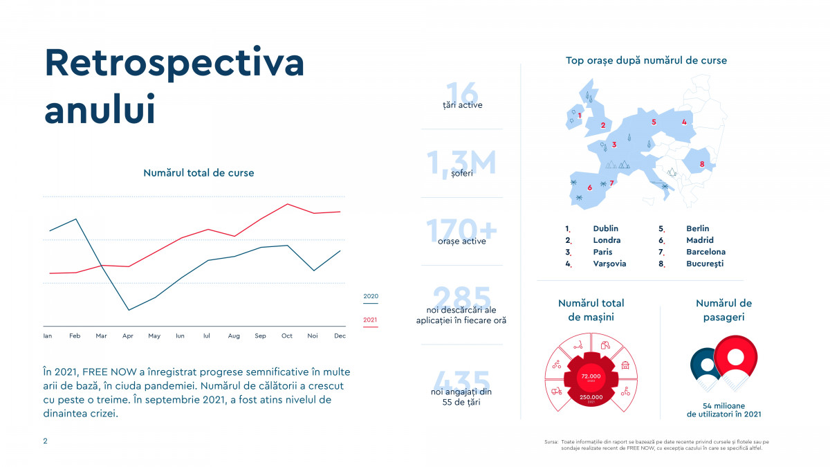 Conform statisticilor de pe platforma FREE NOW, numărul total de utilizatori din toate țările în care operează a ajuns la 54 de milioane. Dintre toate cele 170 de orașe europene în care funcționează aplicația, Bucureștiul s-a clasat pe locul opt în 2021 în ceea ce privește numărul de curse, în timp ce o distanță totală de aproape 24 de milioane de kilometri a fost parcursă în România, echivalentul a 62 de ori distanța dintre Pământ și Lună. Valoarea medie a unei călătorii a fost de aproximativ 17 lei, iar distanța medie a fost de puțin peste 5 km.