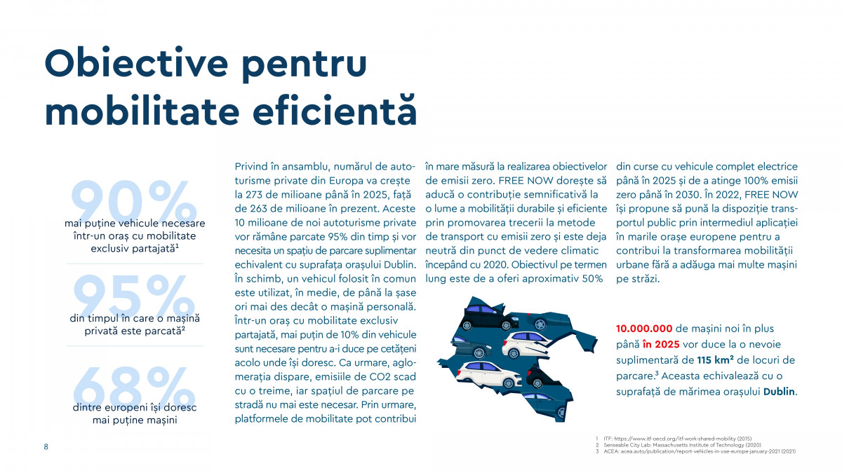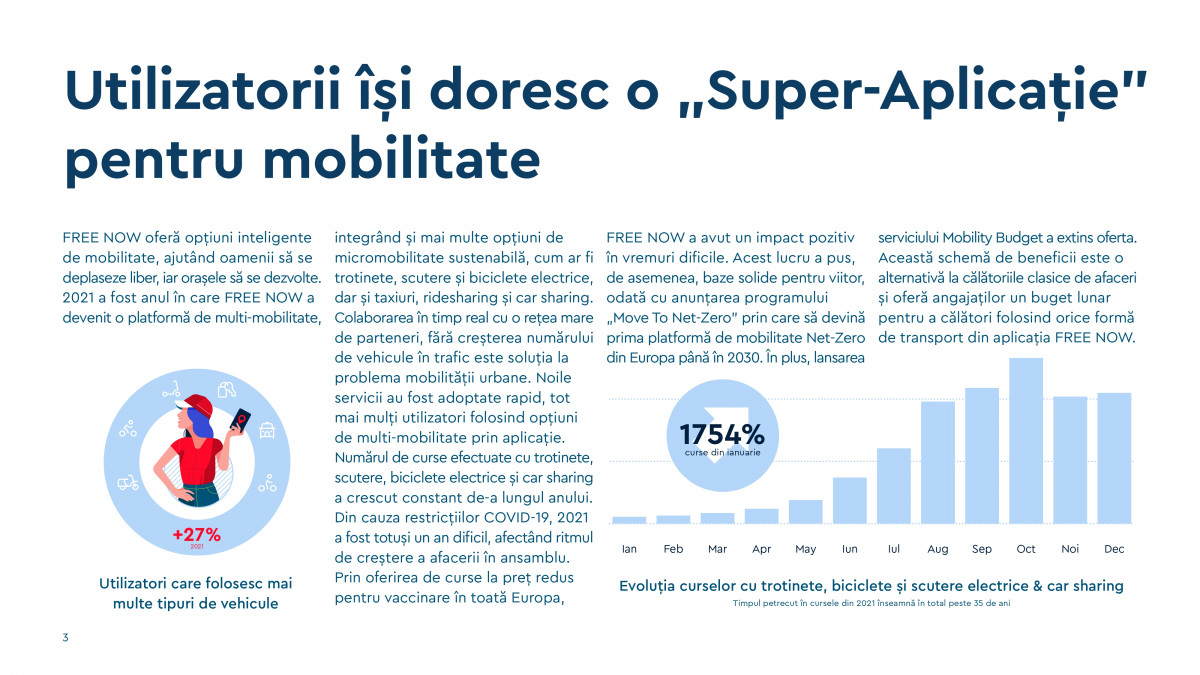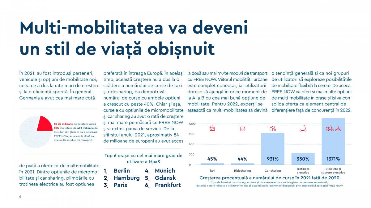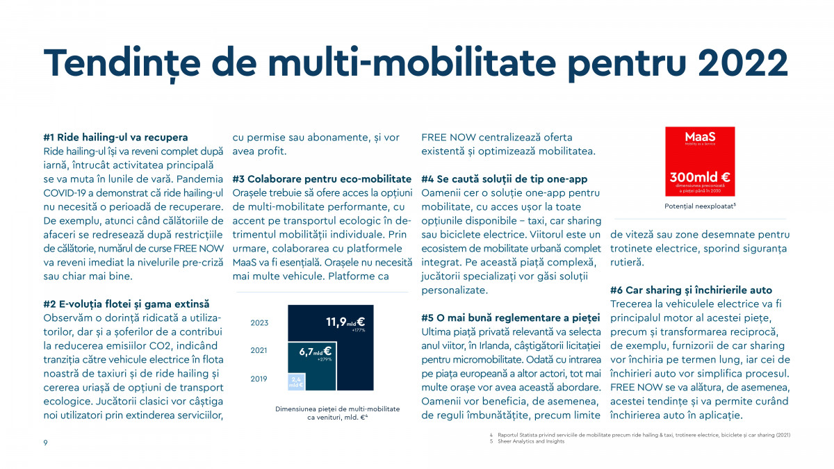 Cu ajutorul datelor din studii externe, sondaje interne și a statisticilor de pe platformă, FREE NOW a realizat Raportul Mobilitatea ca Serviciu (MaaS), prin care analizează bilanțul anului trecut, dar și perspectivele și tendințele industriei de multi-mobilitate pentru anul 2022.