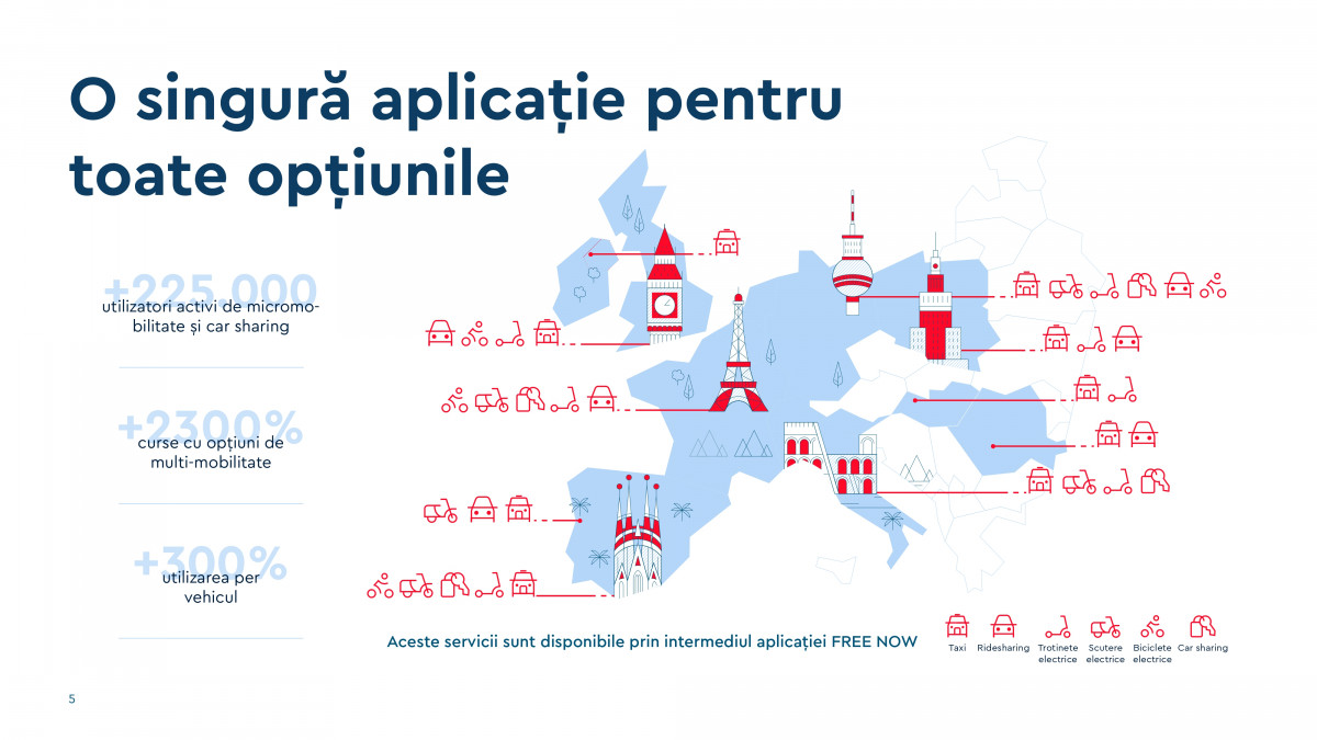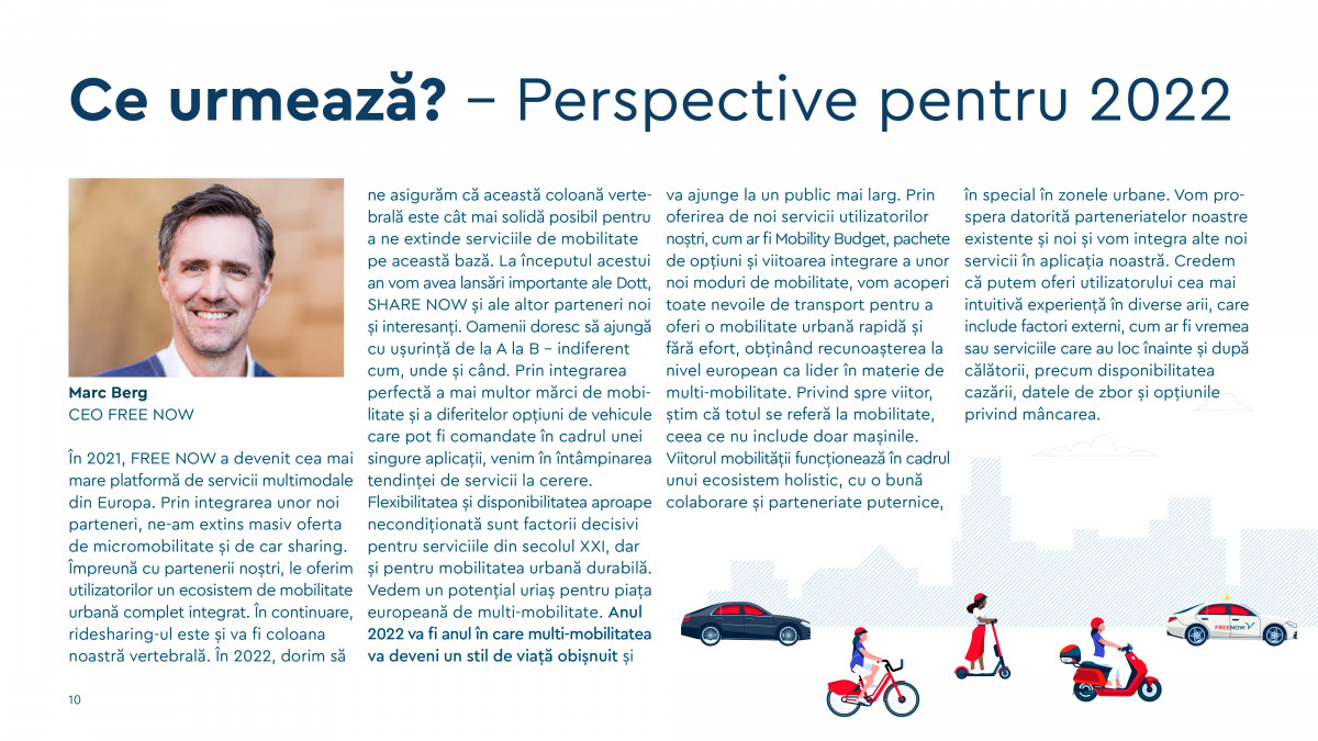 „Oamenii doresc să ajungă cu ușurință de la A la B oricând au nevoie. Prin integrarea perfectă a mai multor mărci de mobilitate și a diferitelor opțiuni de vehicule care pot fi comandate în cadrul unei singure aplicații, venim în întâmpinarea tendinței de servicii la cerere. Flexibilitatea și disponibilitatea aproape necondiționată sunt factorii decisivi pentru serviciile din secolul XXI, dar și pentru mobilitatea urbană sustenabilă. Vedem un potențial uriaș pentru piața europeană de multi-mobilitate. Anul 2022 va fi anul în care multi-mobilitatea va deveni un stil de viață obișnuit și va ajunge la un public mai larg”, spune Marc Berg, CEO FREE NOW.