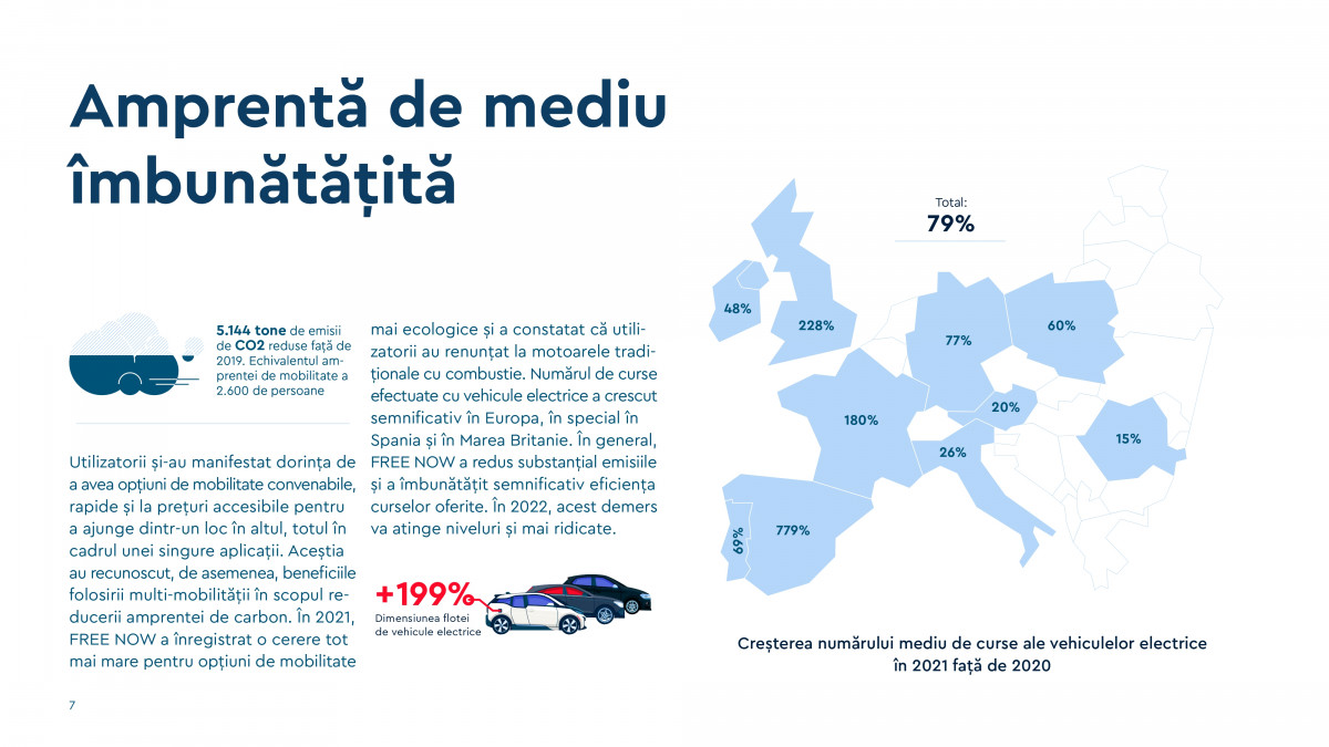 Potrivit raportului, în 2021, FREE NOW a înregistrat o cerere ridicată pentru opțiuni de mobilitate mai ecologice și a observat tendința utilizatorilor de a renunța la motoarele tradiționale cu combustie. Numărul de curse efectuate cu ajutorul vehiculelor electrice a crescut semnificativ în Europa, cu 79%. Astfel, numai în România, numărul mediu de curse cu vehicule electrice a crescut în 2021 cu 15% față de 2020.