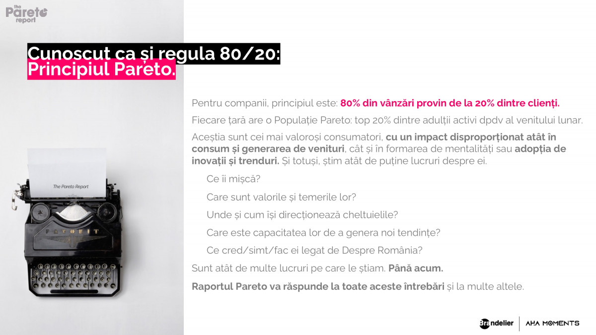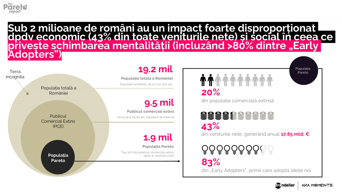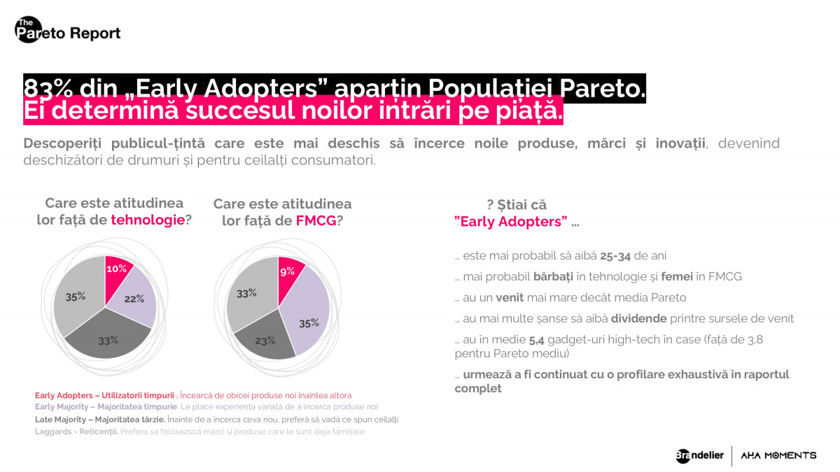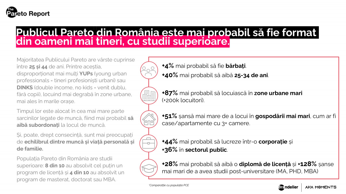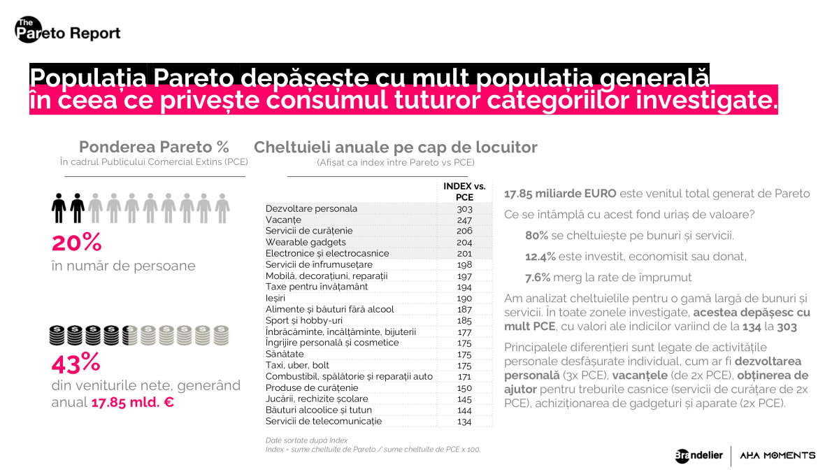 “Publicul Pareto are o pondere numerică de 20%, dar una valorică de 43%, având un impact financiar major pe multe categorii de bunuri și servicii. Spre exemplu, Populația Pareto cheltuie în tursim de 2,5 ori mai mult (suma per capita), pe bunuri de larg consum de 1.8 ori mai mult și pe gadget-uri de 2 ori mai mult. Impactul economic disproporționat nu este singular, fiind dublat de un impact semnificativ în mentalitate și a adopție a inovațiilor. Astfel, Publicul Pareto se distinge prin dorința de auto-progres, de a fi cel mai bun și de a avea influență, devenind un motor de generare de idei, atitudini si comportamente noi. Drept dovadă, în analiza Vizionarilor (Early Adopters), am identifcat că 83% dintre cei care încearcă noile tendințe de piață vin din Publicul Pareto și doar 17% din Publicul Comercial Extins, confirmând că impactul Pareto nu e deloc de ignorat.", declară Manuela Mancaș, fondator AHA Moments și co-fondator The Pareto Report. AHA Moments este o agenție locală de cercetare de marketing, lansată in 2021, recunoscută deja în piață pentru studiile strategice cu grad ridicat de complexitate, datorită expertizei echipei sale de cercetători și statisticieni (+15 ani experiență).