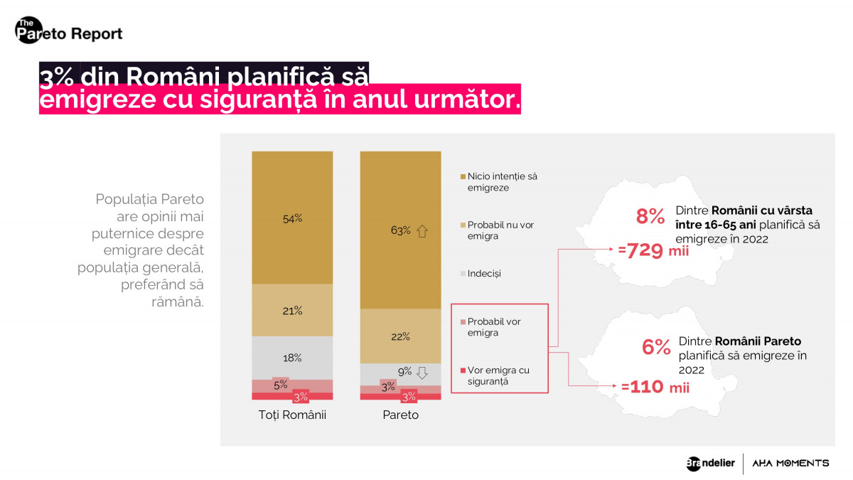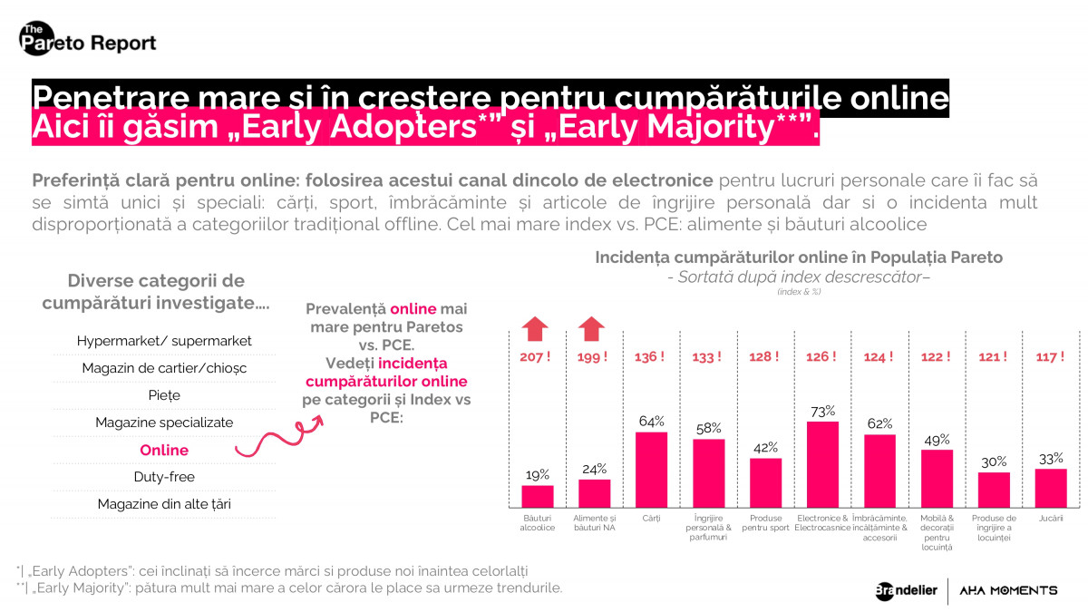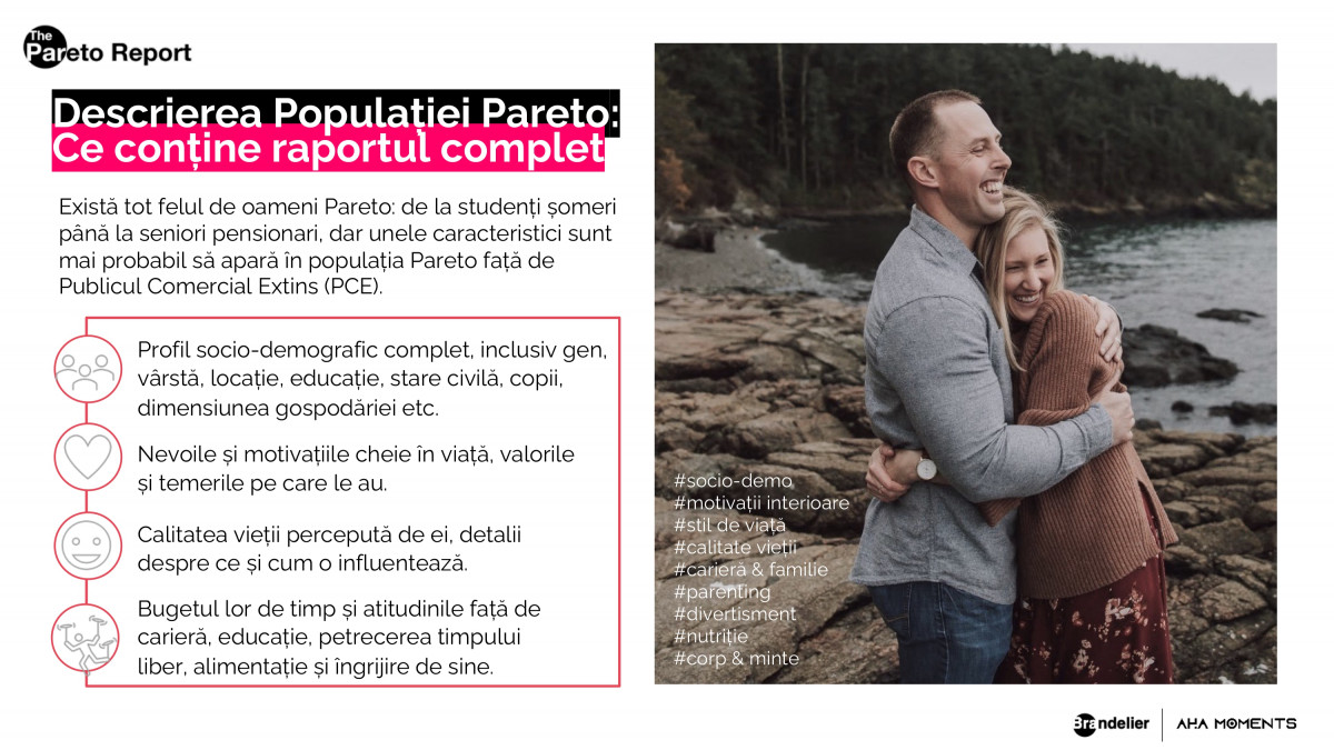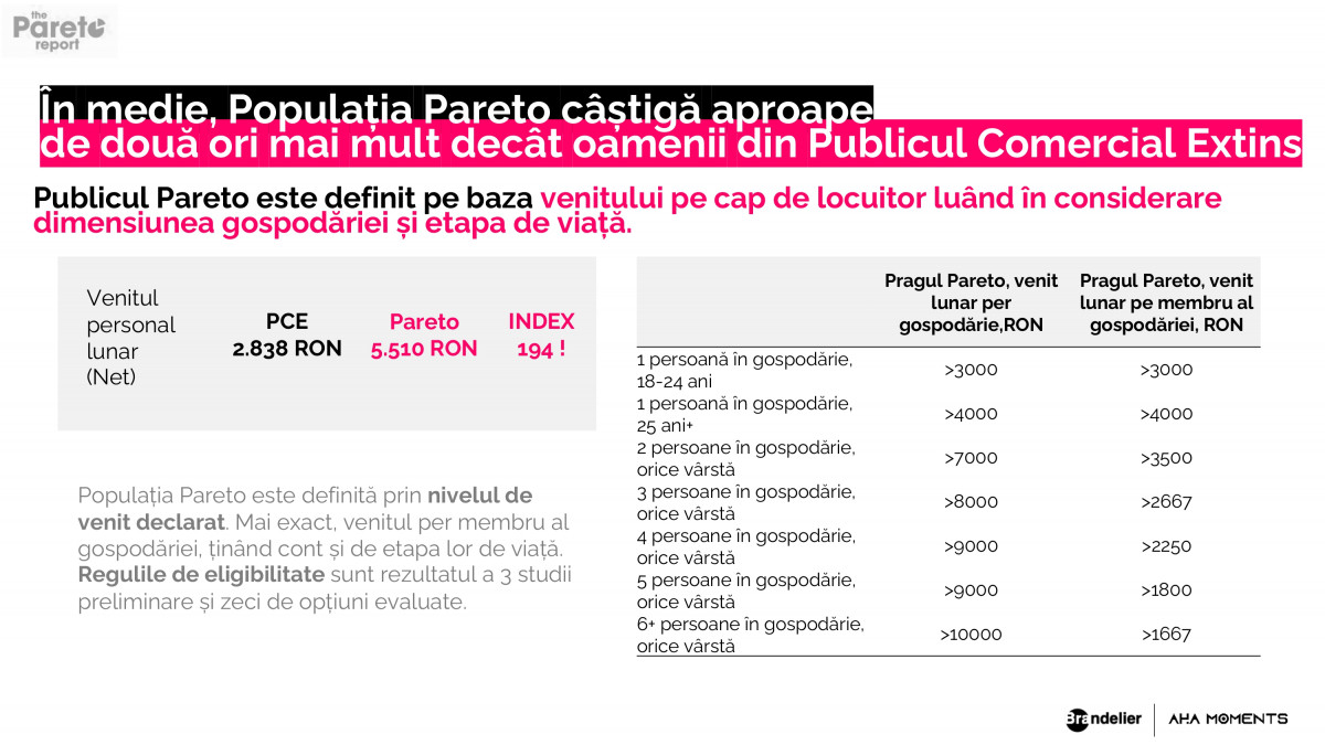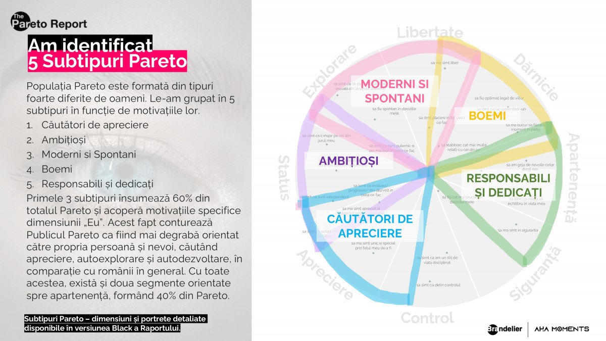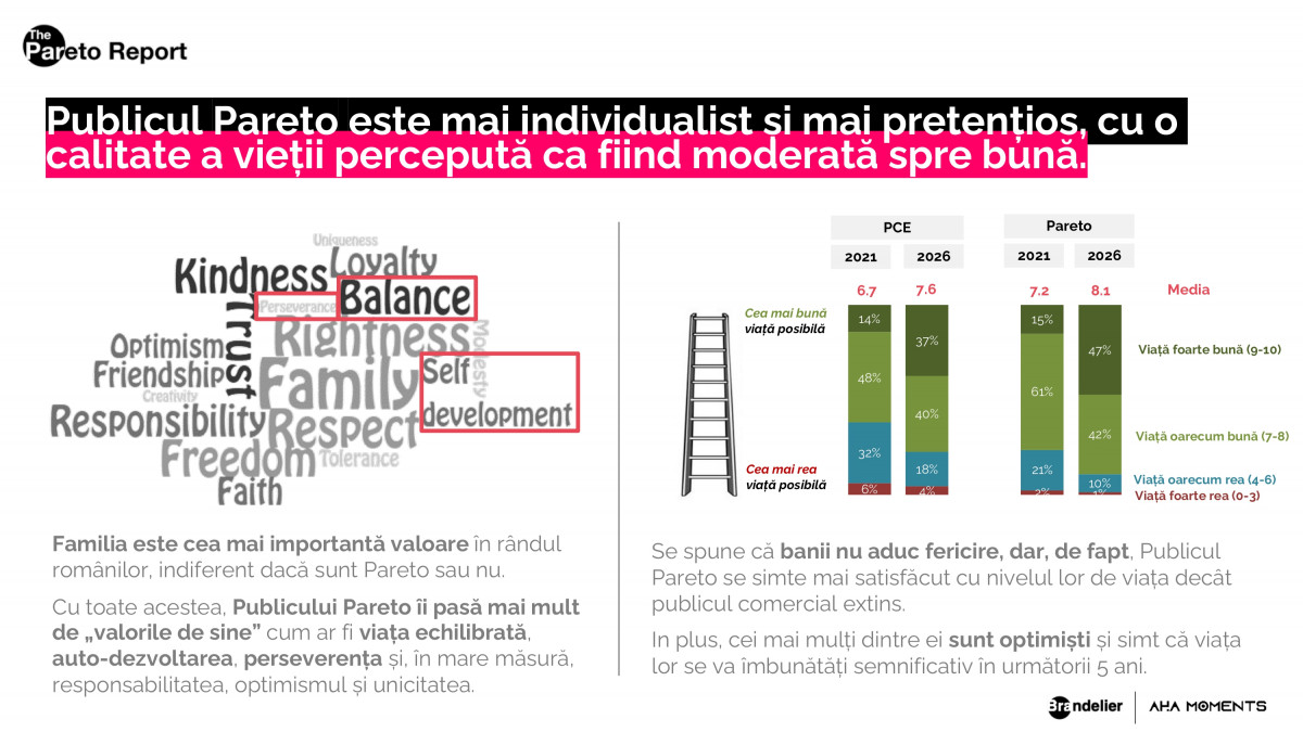 “Publicul Pareto are o pondere numerică de 20%, dar una valorică de 43%, având un impact financiar major pe multe categorii de bunuri și servicii. Spre exemplu, Populația Pareto cheltuie în tursim de 2,5 ori mai mult (suma per capita), pe bunuri de larg consum de 1.8 ori mai mult și pe gadget-uri de 2 ori mai mult. Impactul economic disproporționat nu este singular, fiind dublat de un impact semnificativ în mentalitate și a adopție a inovațiilor. Astfel, Publicul Pareto se distinge prin dorința de auto-progres, de a fi cel mai bun și de a avea influență, devenind un motor de generare de idei, atitudini si comportamente noi. Drept dovadă, în analiza Vizionarilor (Early Adopters), am identifcat că 83% dintre cei care încearcă noile tendințe de piață vin din Publicul Pareto și doar 17% din Publicul Comercial Extins, confirmând că impactul Pareto nu e deloc de ignorat.", declară Manuela Mancaș, fondator AHA Moments și co-fondator The Pareto Report. AHA Moments este o agenție locală de cercetare de marketing, lansată in 2021, recunoscută deja în piață pentru studiile strategice cu grad ridicat de complexitate, datorită expertizei echipei sale de cercetători și statisticieni (+15 ani experiență).
