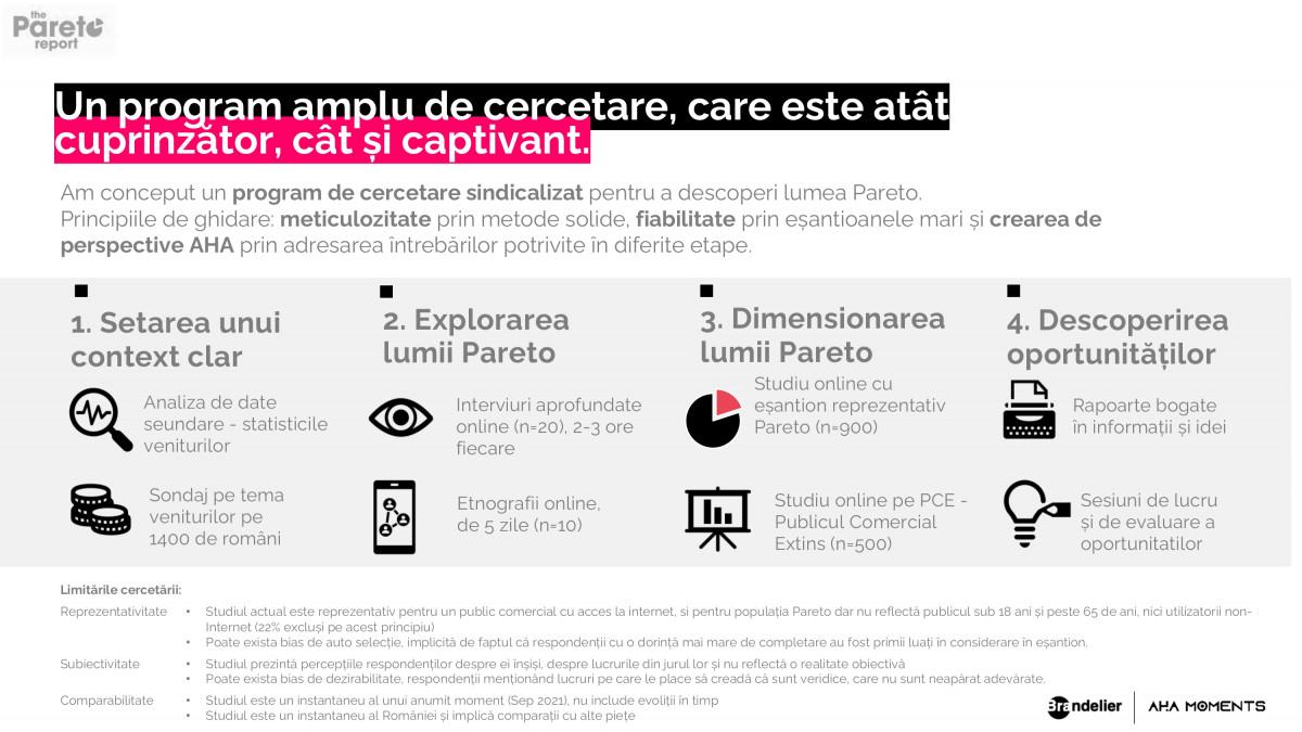 Raportul Pareto este un studiu sindicalizat realizat in urma unui plan de cercetare complex in 4 etape: 1) analiza veniturilor din România, 2) interviuri și etnografii cu 20 de români Pareto, 3) un studiu cantitativ 4) sesiuni creative de lucru pentru activarea rezultatelor. Cea de-a treia etapa, studiul cantitativ, a cuprins un esantion de 1400 de persoane, dintre care 900 reprezentative pentru Populatia Pareto, iar 500 pentru Publicul Comercial Extins. Raportul este disponibil in versiunile Free, White Paper, Gold Report si Black Report.