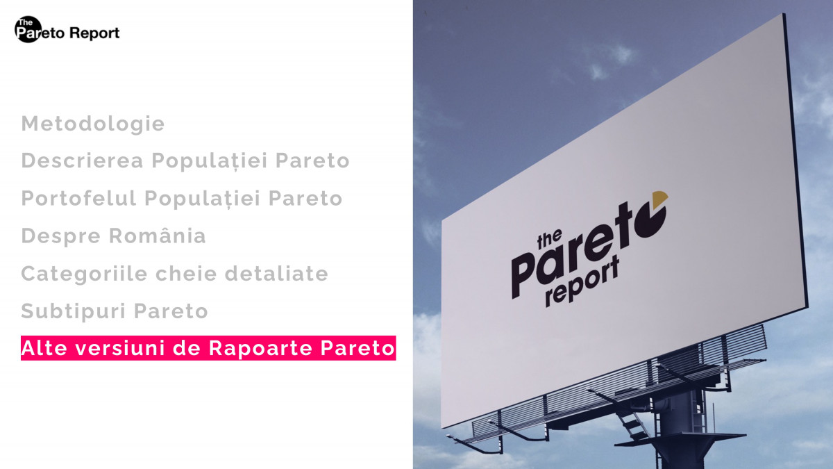 Este pentru prima oara când Raportul Pareto devine accesibil tuturor. Studiul este disponibil într-o versiune gratuita care conține informații esențiale despre cine sunt oamenii Pareto in Romania, dar și sub forma unor rapoarte de complexitate diferită in funcție de nevoile și bugetele companiilor care au nevoie de aceste date.