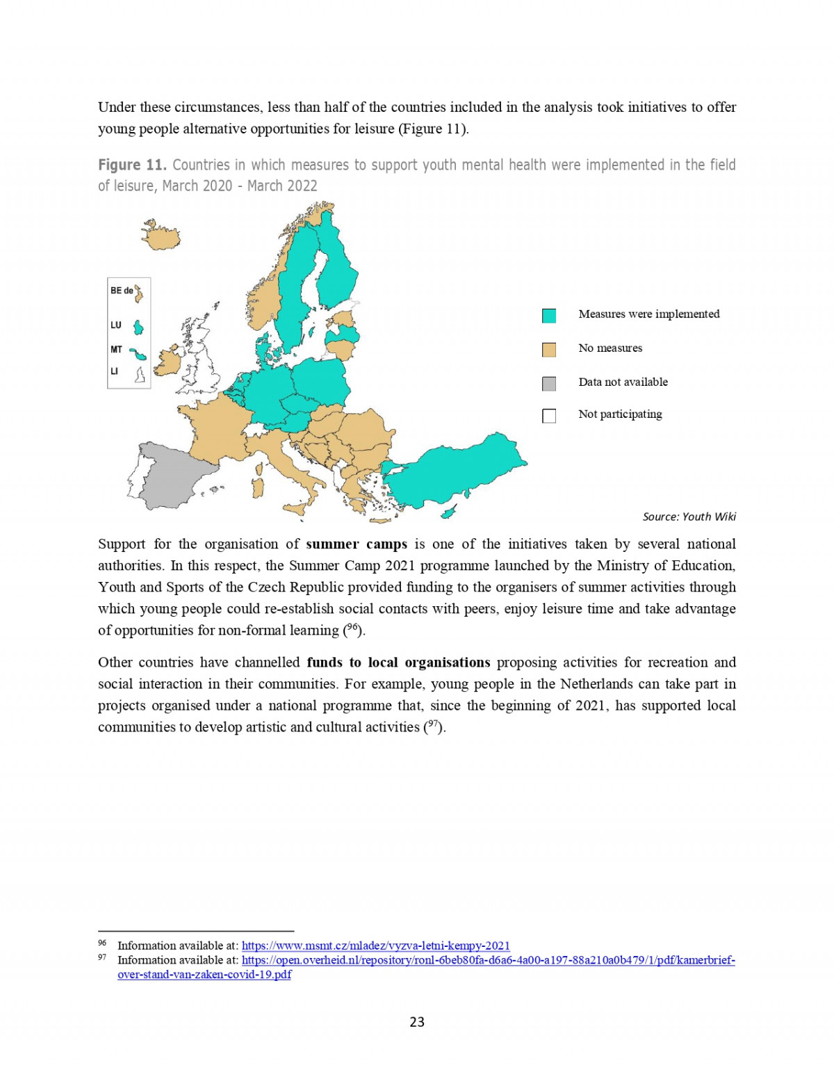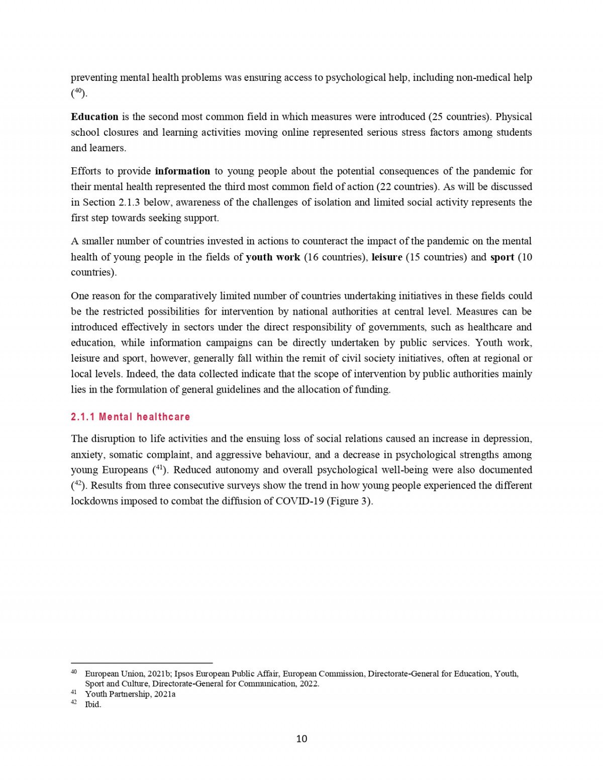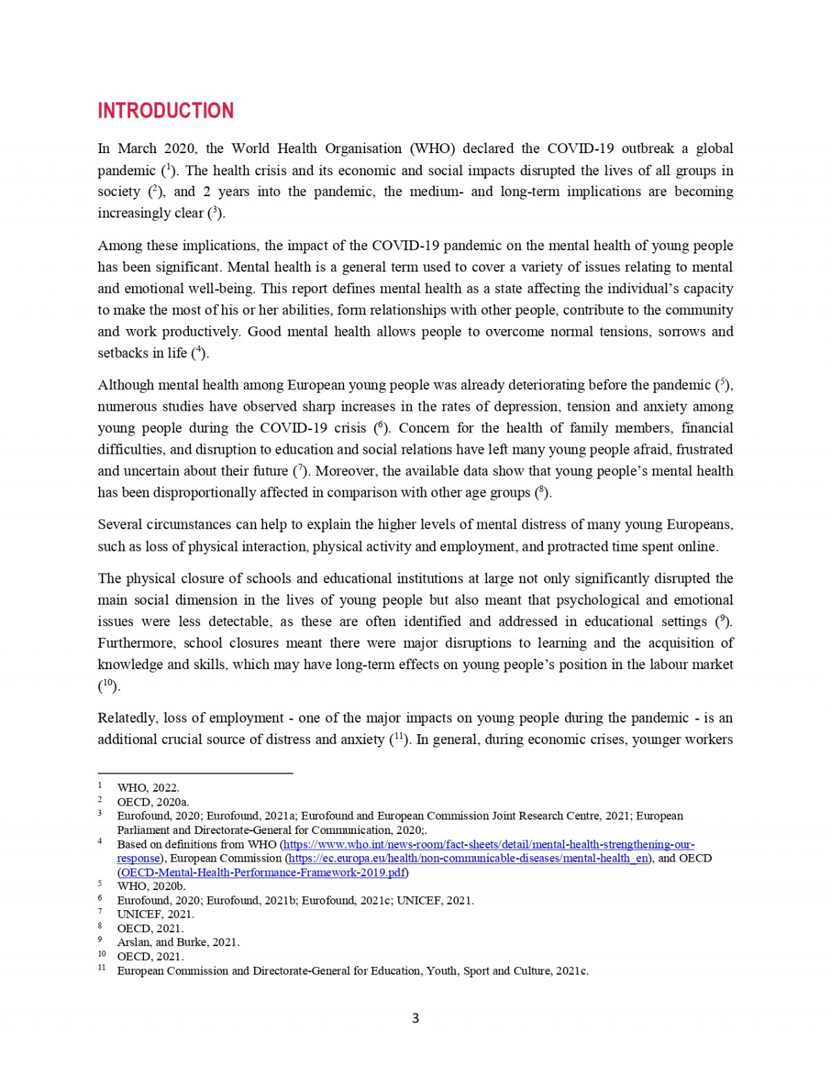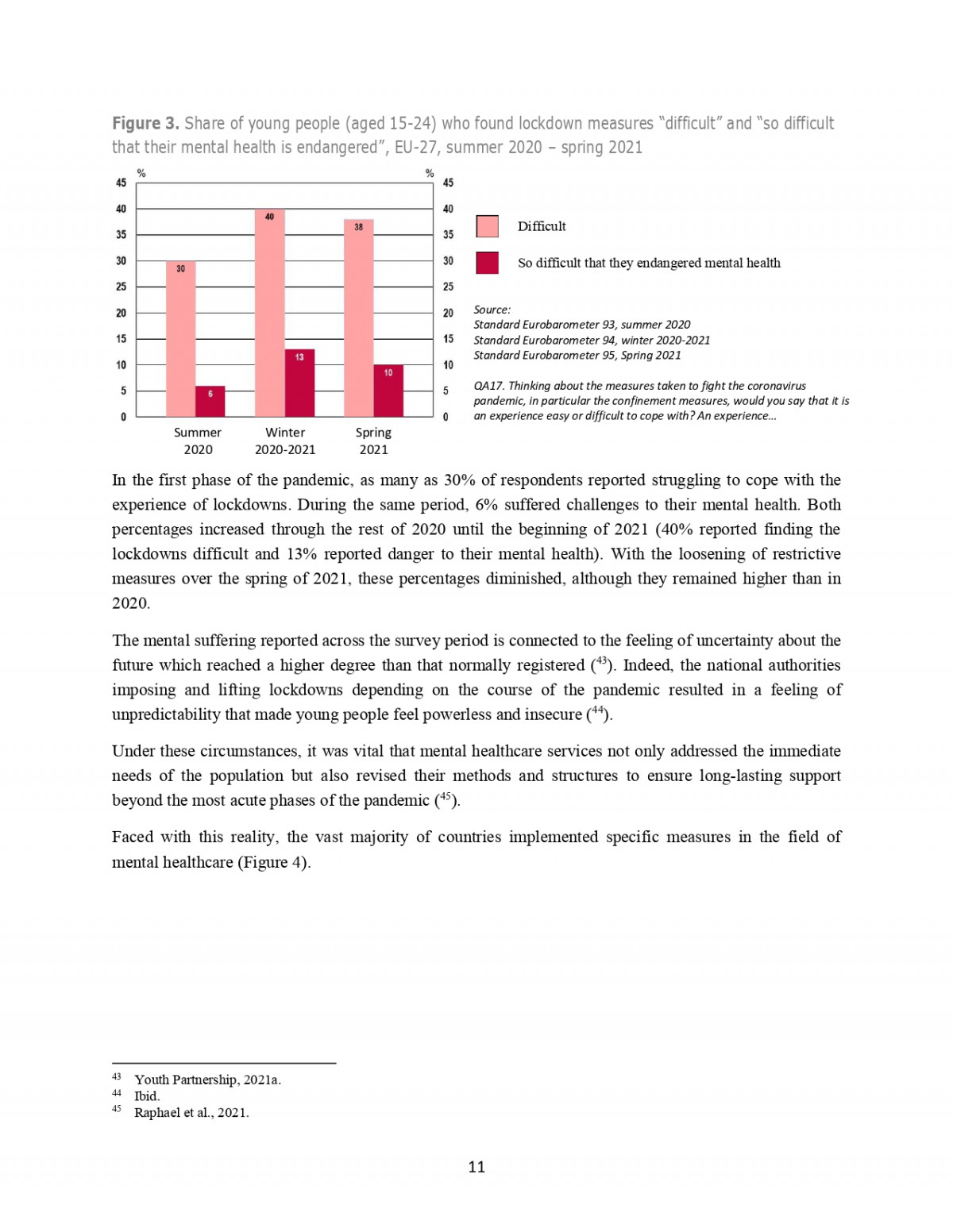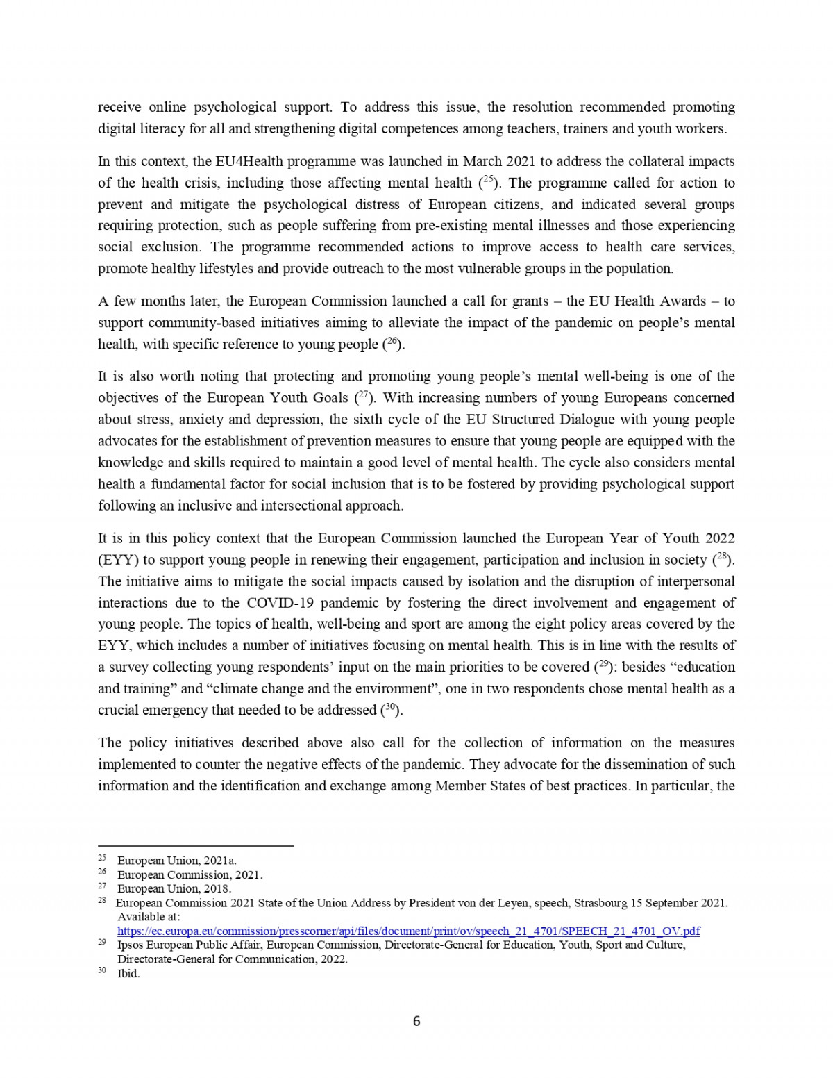 Pe lângă eforturile statelor membre, cum ar fi România, Comisia Europeană a desemnat 2022 drept Anul European al Tineretului în recunoașterea sacrificiilor tinerilor în timpul pandemiei COVID-19. Un sondaj Eurobarometru Flash din 2022 arată tineri din 16 dintre cele 27 de state membre care au în vedere îmbunătățirea sănătății și bunăstării mentale și fizice ca cea mai importantă prioritate pentru Anul European al Tineretului.
