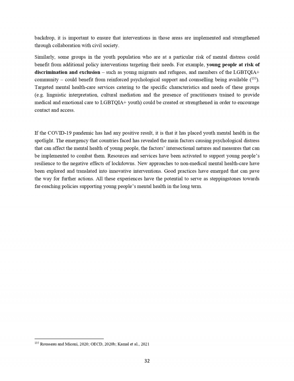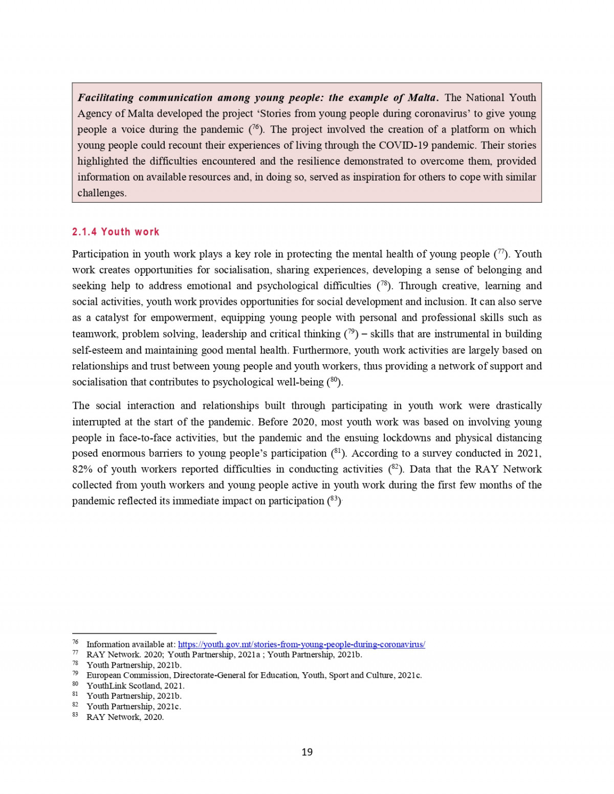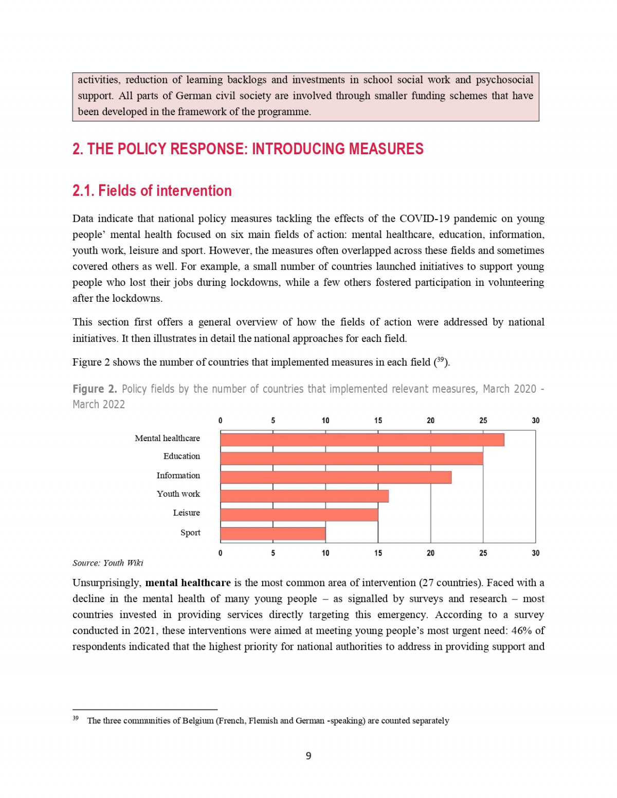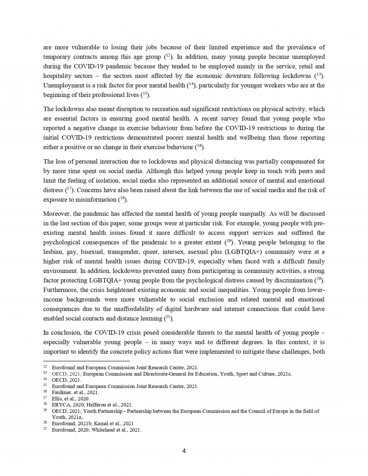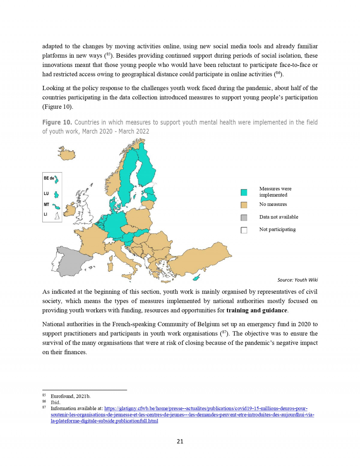 Pe lângă eforturile statelor membre, cum ar fi România, Comisia Europeană a desemnat 2022 drept Anul European al Tineretului în recunoașterea sacrificiilor tinerilor în timpul pandemiei COVID-19. Un sondaj Eurobarometru Flash din 2022 arată tineri din 16 dintre cele 27 de state membre care au în vedere îmbunătățirea sănătății și bunăstării mentale și fizice ca cea mai importantă prioritate pentru Anul European al Tineretului.