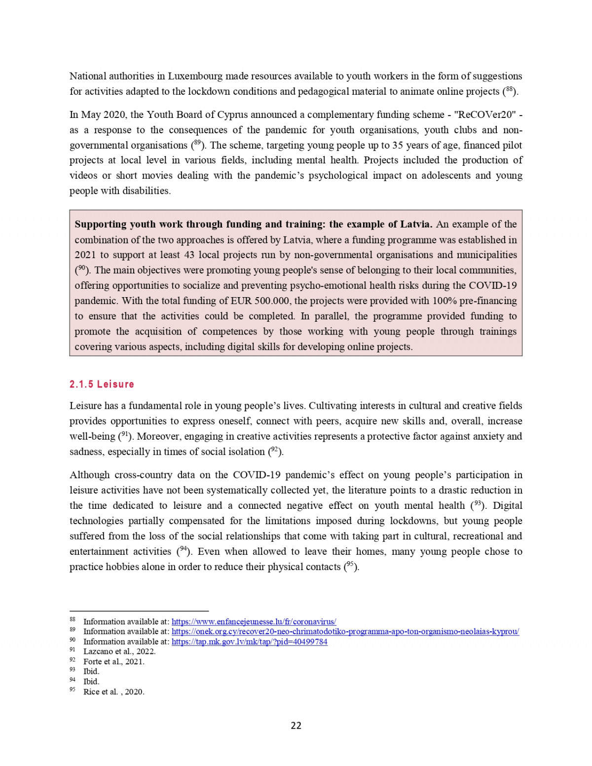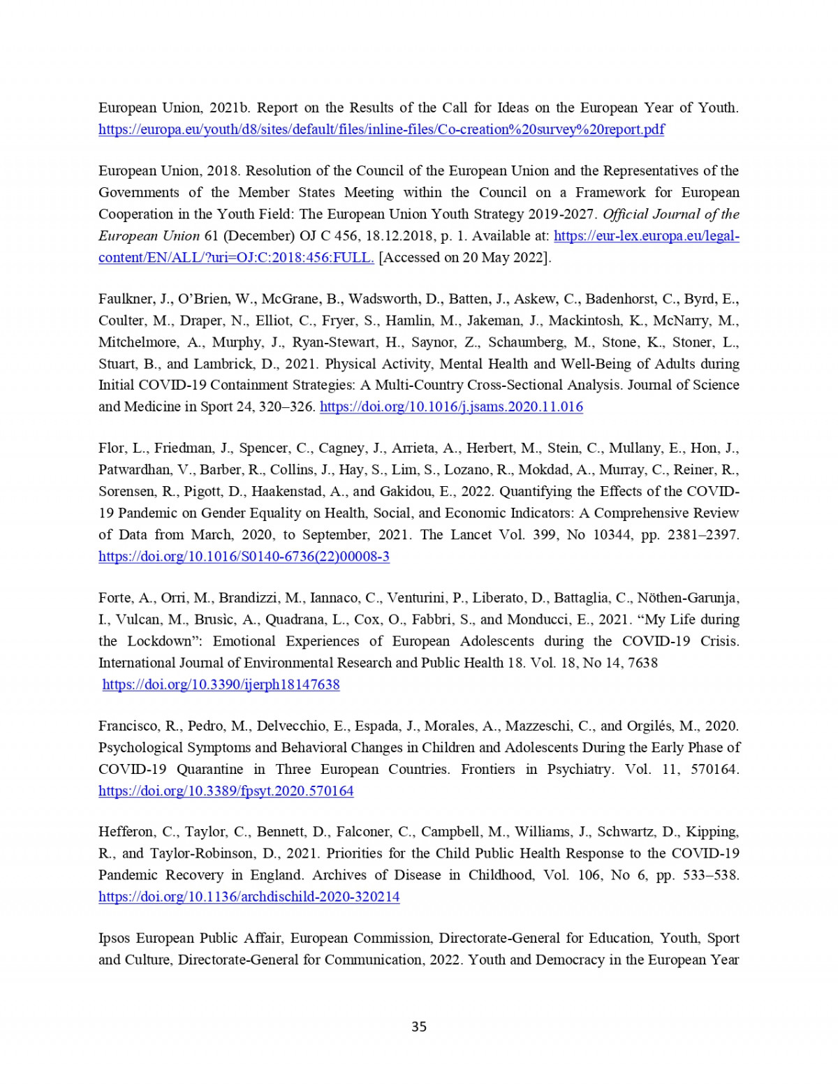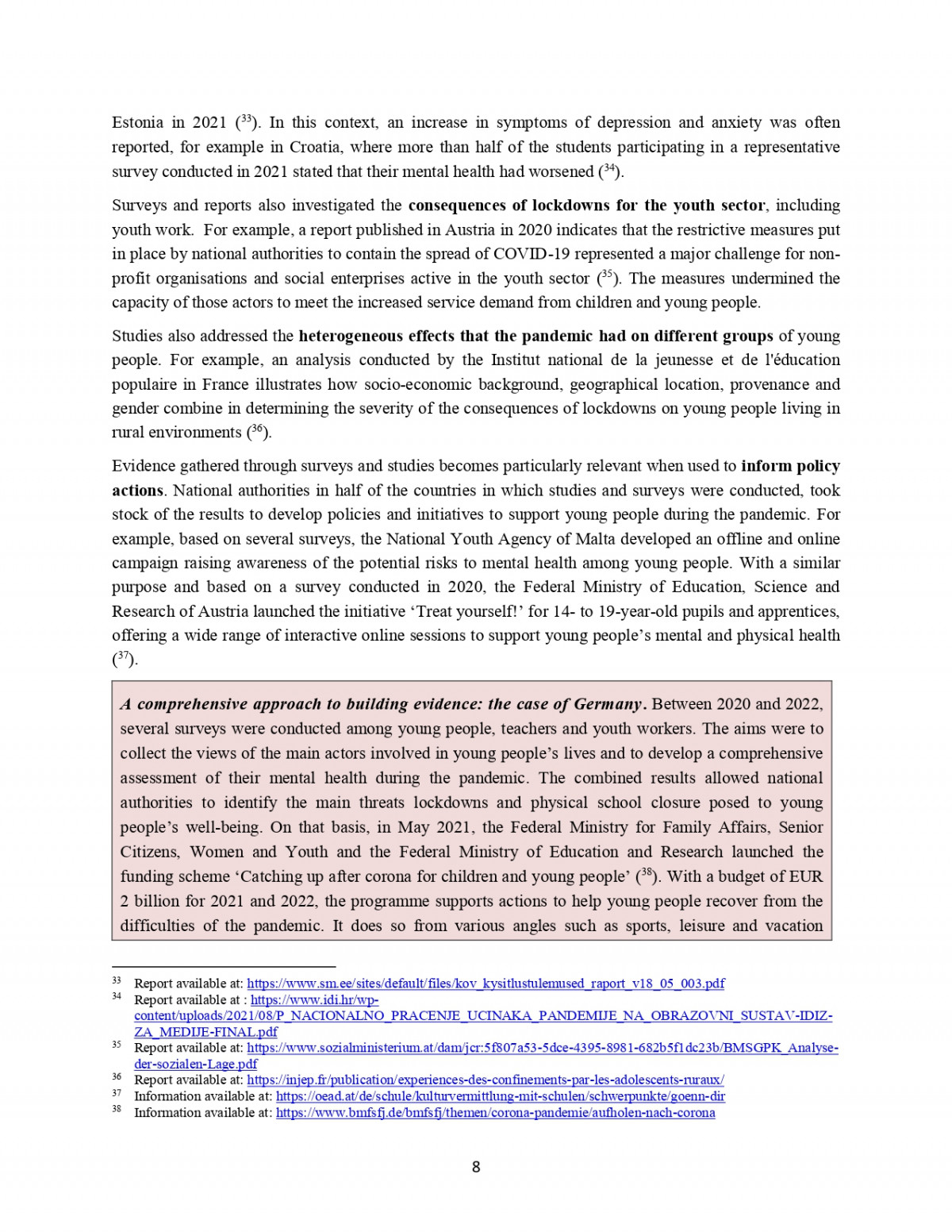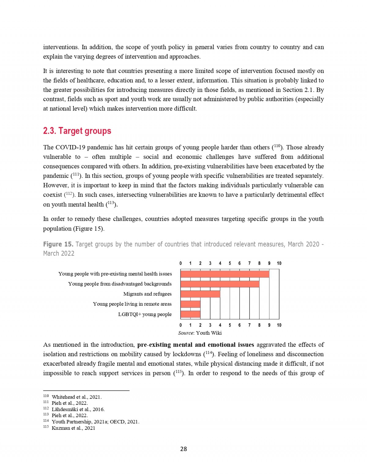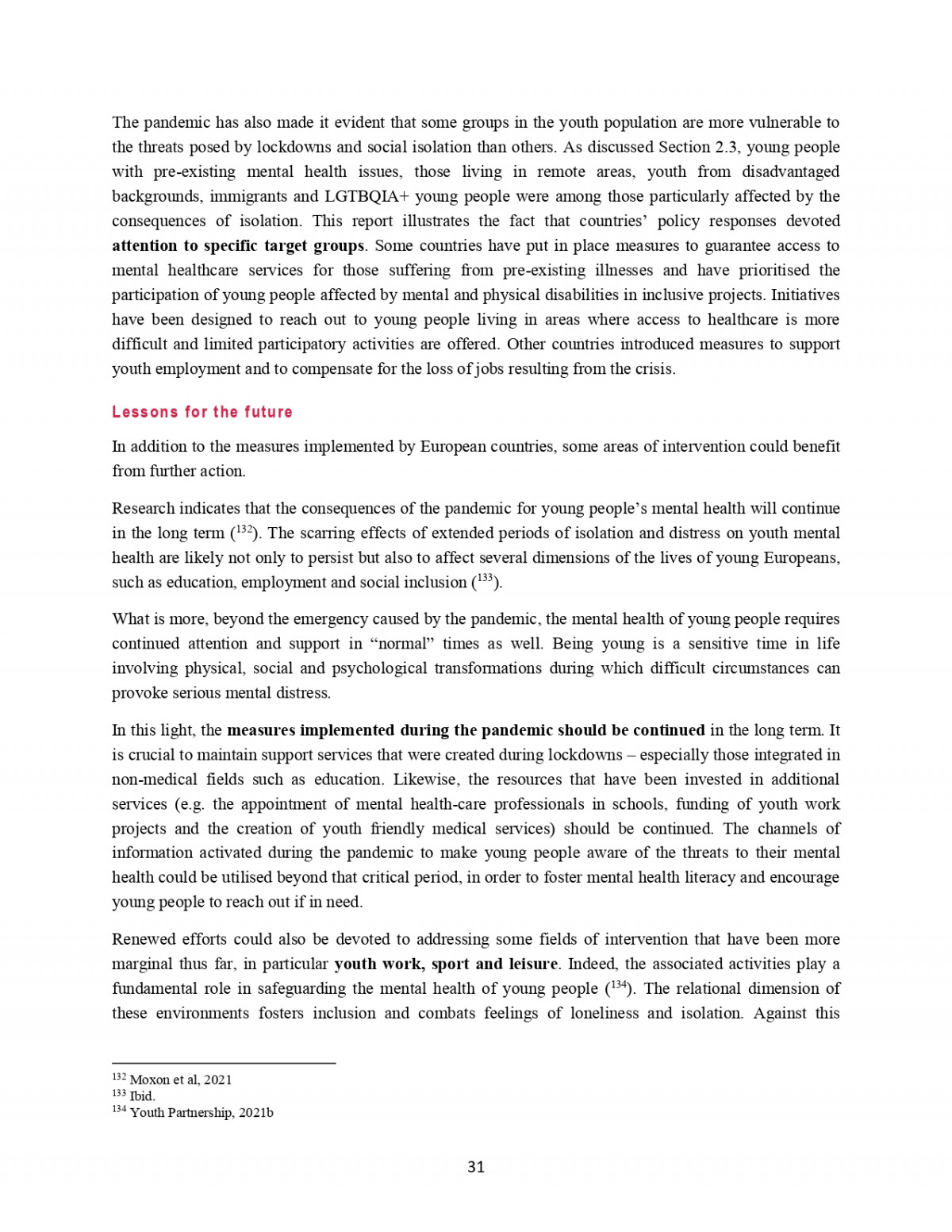 Pe lângă eforturile statelor membre, cum ar fi România, Comisia Europeană a desemnat 2022 drept Anul European al Tineretului în recunoașterea sacrificiilor tinerilor în timpul pandemiei COVID-19. Un sondaj Eurobarometru Flash din 2022 arată tineri din 16 dintre cele 27 de state membre care au în vedere îmbunătățirea sănătății și bunăstării mentale și fizice ca cea mai importantă prioritate pentru Anul European al Tineretului.