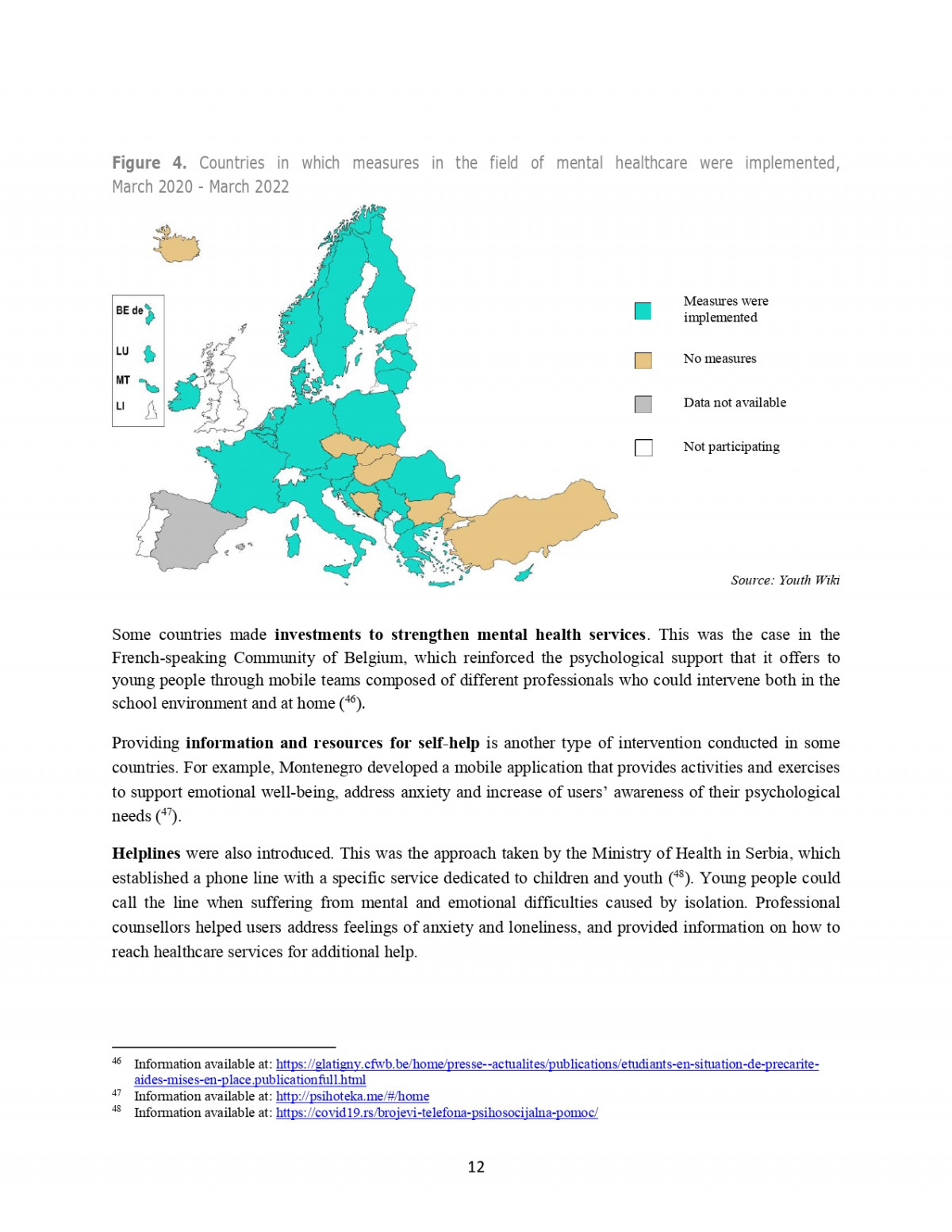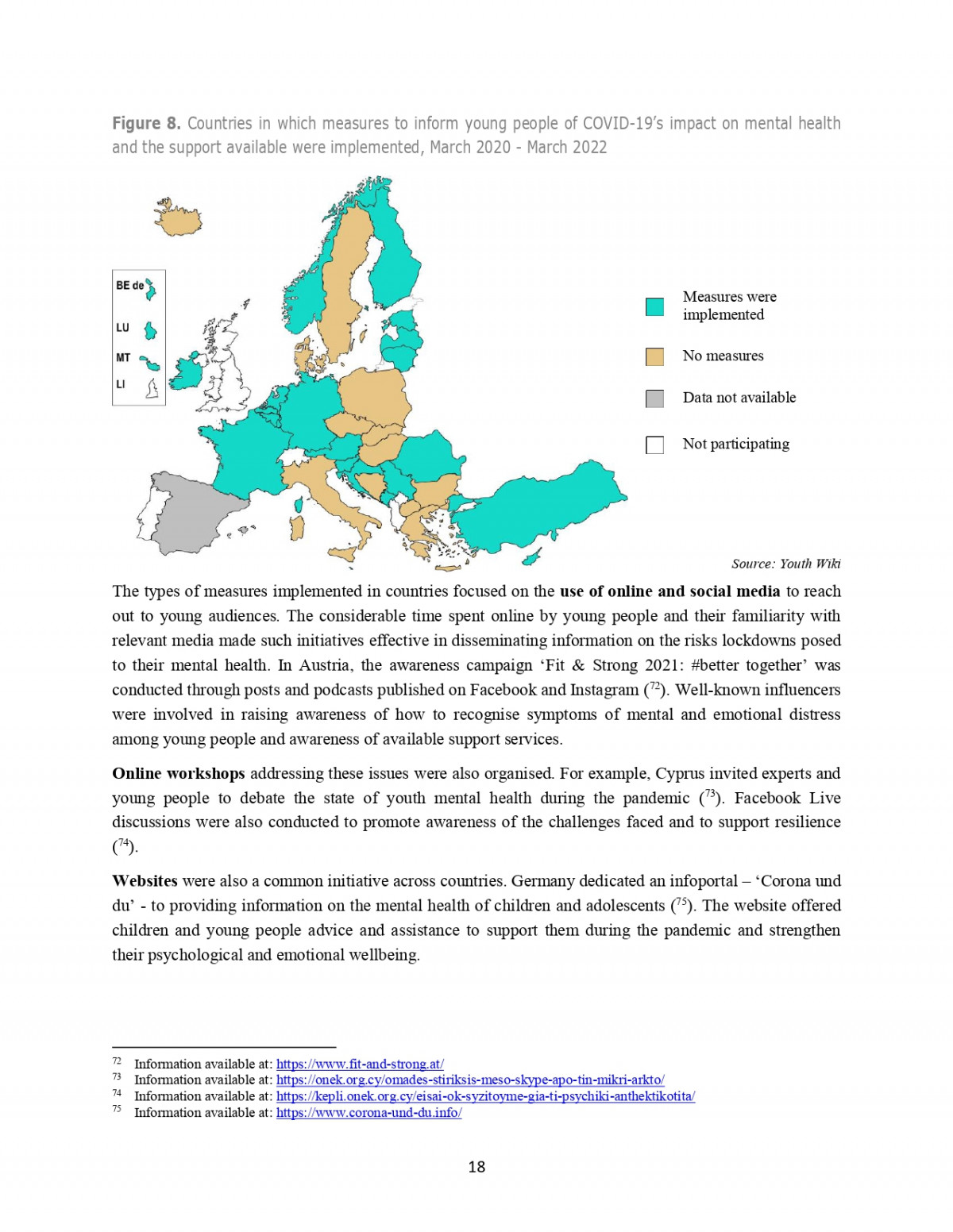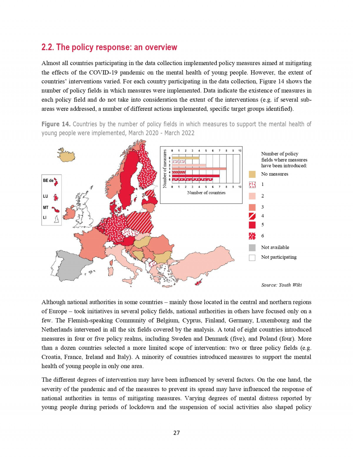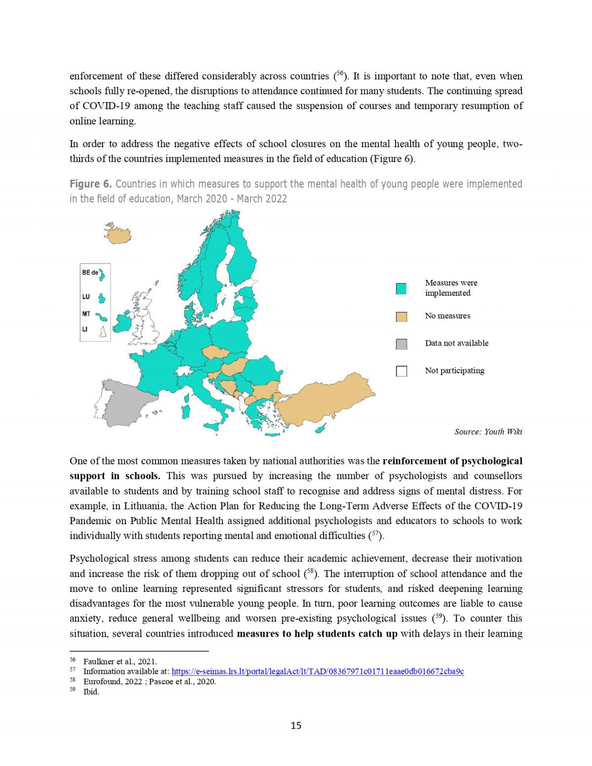 Țările europene au adoptat o metodă proactivă de abordare a provocărilor de sănătate mentală pentru tineret, în timpul pandemiei. Una dintre cele mai des întâlnite măsuri a fost consolidarea sprijinului psihologic în școli, atât prin creșterea numărului de psihologi și consilieri disponibili pentru elevi, cât și prin instruirea personalului școlar pentru a recunoaște și aborda semnele de afecțiuni mentale.