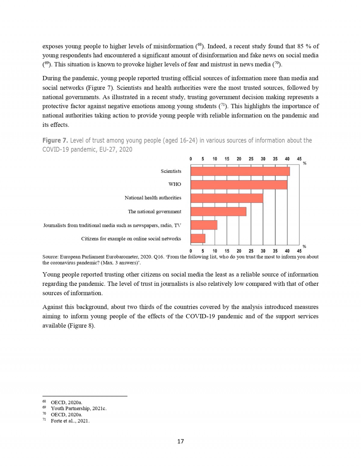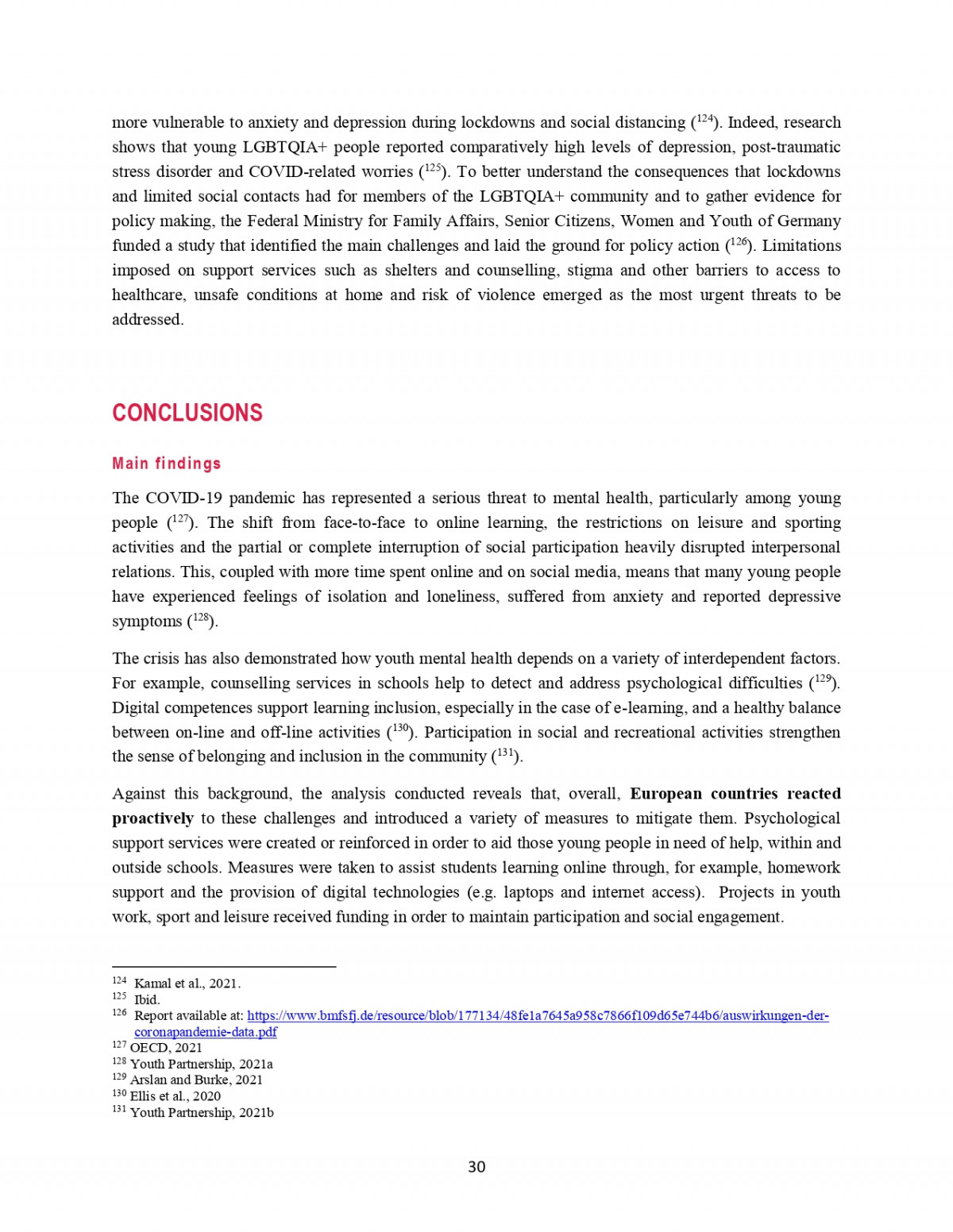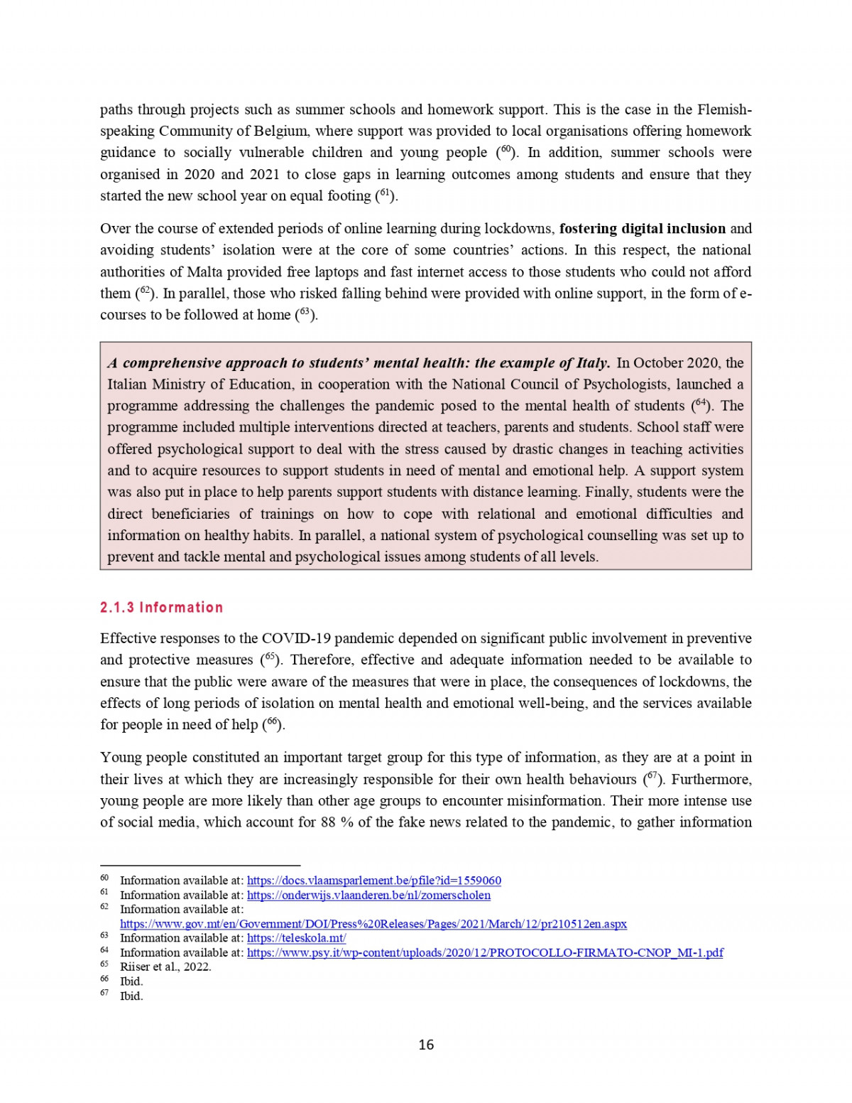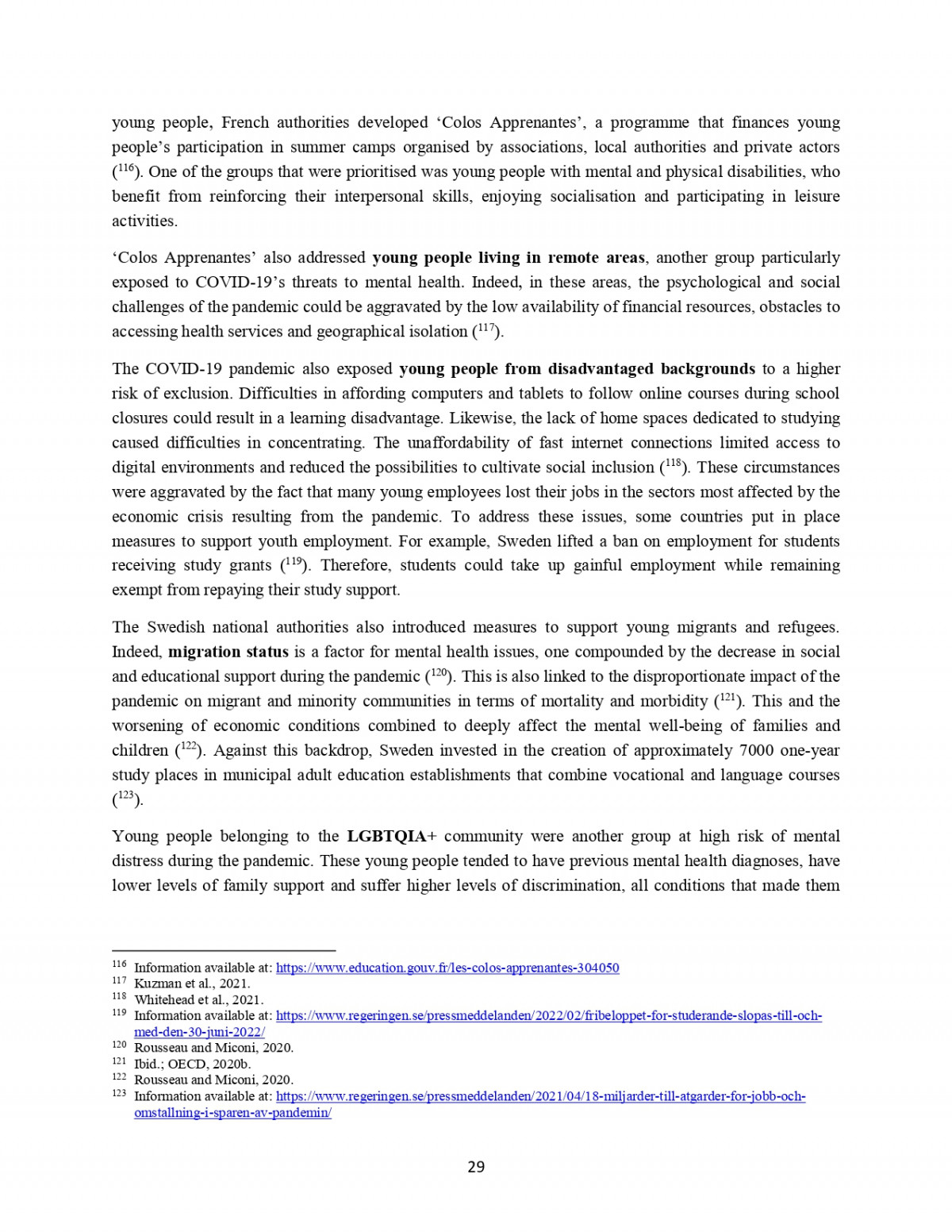 Țările europene au adoptat o metodă proactivă de abordare a provocărilor de sănătate mentală pentru tineret, în timpul pandemiei. Una dintre cele mai des întâlnite măsuri a fost consolidarea sprijinului psihologic în școli, atât prin creșterea numărului de psihologi și consilieri disponibili pentru elevi, cât și prin instruirea personalului școlar pentru a recunoaște și aborda semnele de afecțiuni mentale.