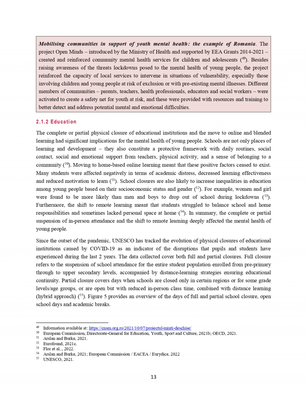 Proiectul Open Minds - introdus de Ministerul Sănătății și susținut prin granturile SEE 2014-2021 - a creat și consolidat serviciile comunitare de sănătate mintală pentru copii și adolescenți (49). Pe lângă sensibilizarea cu privire la amenințările pe care le reprezintă lockdown urile pentru sănătatea mintală a tinerilor, proiectul