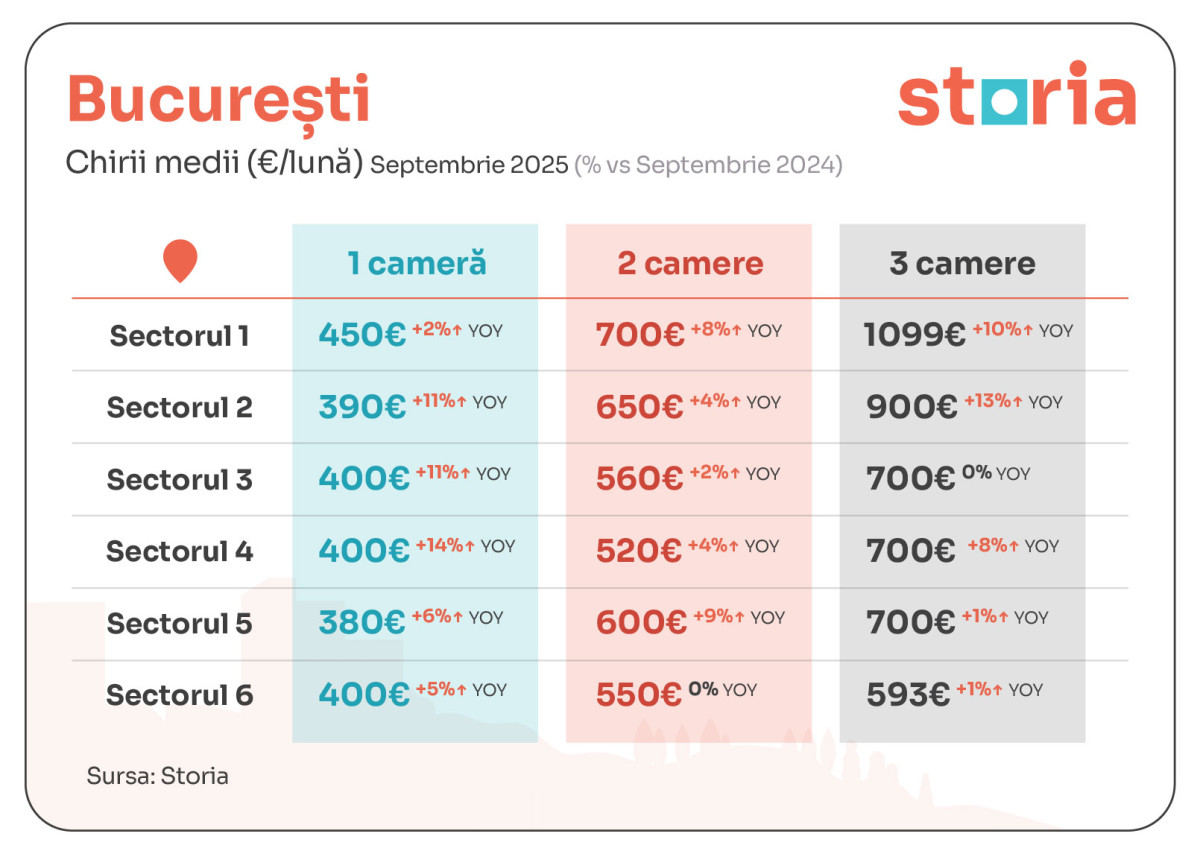 Sectorul 1 rămâne cel mai scump, cu o chirie medie de 792 de euro, urmat de Sectorul 2, unde media este de 676 de euro. La polul opus, cele mai accesibile chirii se regăsesc în Sectorul 6, cu 521 de euro, și Sectorul 4, unde nivelul mediu este de 534 de euro. Cele mai mari creșteri anuale s-au înregistrat la garsonierele din Sectorul 4 (+14%), iar cele mai vizibile variații lunare au fost în Sectorul 5, cu +9% în cazul garsonierelor și +8% în cazul apartamentelor cu trei camere.