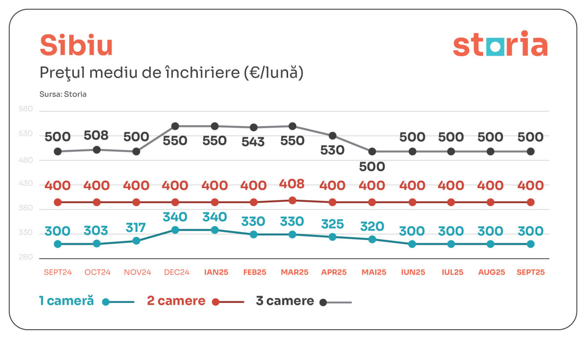 În SIBIU, chiriile s-au menținut la același nivel ca în 2024 și ca în august 2025: 300 de euro pentru garsoniere, 400 de euro pentru două camere și 500 de euro pentru trei camere.