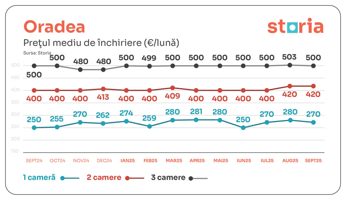 ORADEA rămâne printre cele mai accesibile orașe, cu garsoniere la 270 de euro (+8% față de anul anterior). La două camere media este 420 de euro, iar la trei camere 500 de euro.