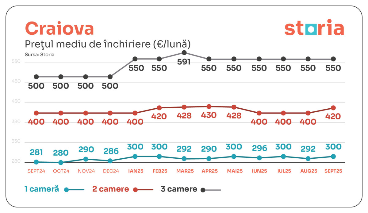 În CRAIOVA, garsonierele s-au scumpit cu 7% față de anul trecut, ajungând la 300 de euro, iar apartamentele cu trei camere au ajuns la 550 de euro, cu 10% peste nivelul din 2024. Apartamentele cu două camere au crescut la 420 de euro, cu 5% mai mari atât față de luna anterioară, cât și față de anul trecut.