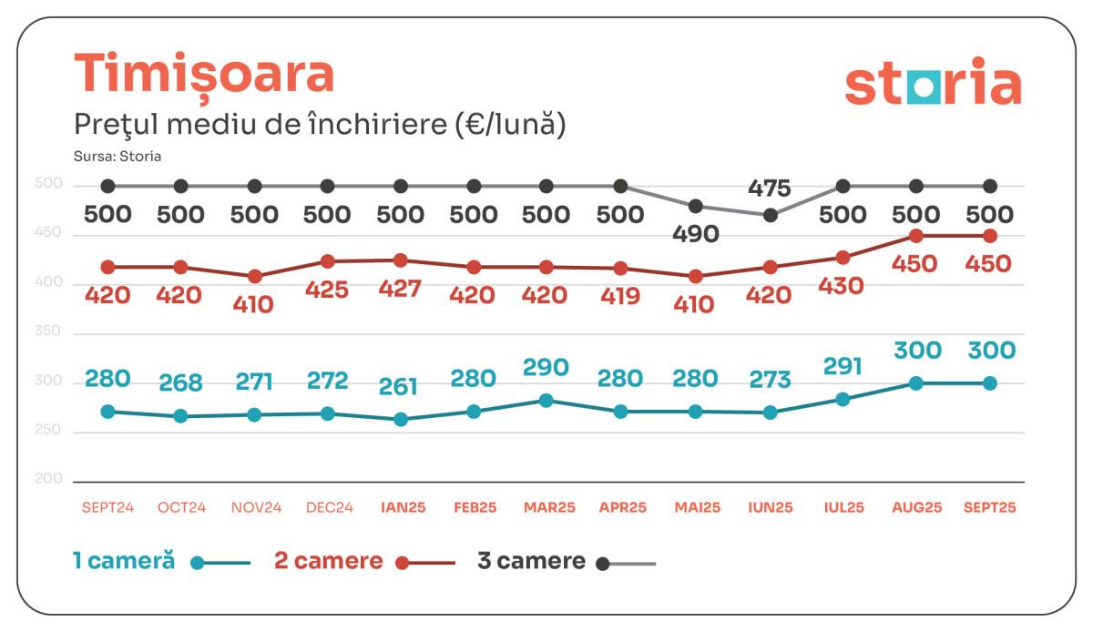 În TIMIȘOARA, chiria medie a garsonierelor este de 300 de euro, cu 7% mai mult decât în urmă cu un an, în timp ce apartamentele cu două camere au ajuns la 450 de euro, tot cu 7% peste nivelul din 2024. Apartamentele cu trei camere se mențin la 500 de euro.