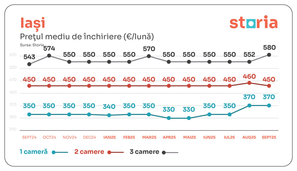 În IAȘI, o garsonieră se închiriază în medie cu 370 de euro, cu 6% mai mult decât în septembrie 2024, în timp ce apartamentele cu trei camere au ajuns la 580 de euro, în creștere cu 7% față de anul anterior. La două camere, chiria medie este de 450 de euro (cu 2% mai mică față de luna anterioară).