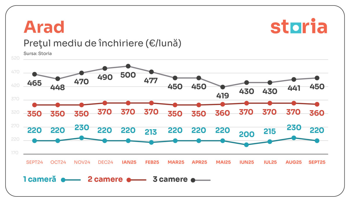 În ARAD, garsonierele se închiriază cu 220 de euro, un nivel constant față de anul trecut. La două camere, prețul a crescut la 360 de euro (+3% față de anul anterior), însă la apartamentele cu trei camere chiria medie a scăzut față de anul trecut cu 3%, la 450 de euro.