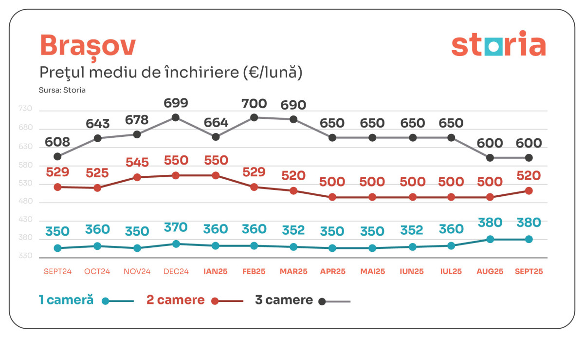 BRAȘOVUL a avut câteva variații, cu o medie de 380 de euro pentru garsoniere (+9% față de anul anterior), 520 de euro pentru două camere ( +4% față de luna august) și 600 de euro pentru trei camere.