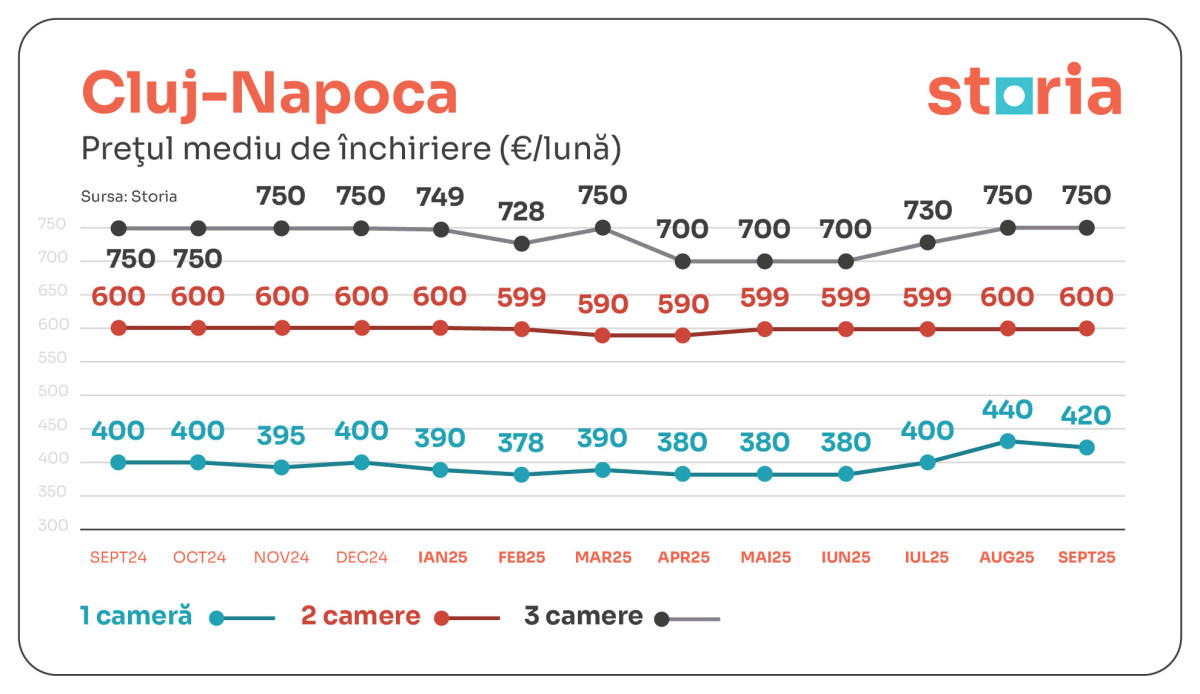 În CLUJ-NAPOCA, chiria medie a unei garsoniere este de 420 de euro (cu 5% mai mare față de anul trecut și cu 5% mai mică față de luna august). În cazul apartamentelor cu două și trei camere, prețurile chiriilor s-au menținut stabile, respectiv de 600 de euro și 750 de euro.
