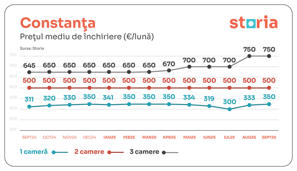 În CONSTANȚA, garsonierele costă în medie 350 de euro, cu 13% mai mult decât în urmă cu un an, iar apartamentele cu trei camere au înregistrat o creștere spectaculoasă de 16%, până la 750 de euro. Prețurile pentru închirierea apartamentelor cu două camere au rămas la fel ca anul și ca luna trecută, de 500 de euro.