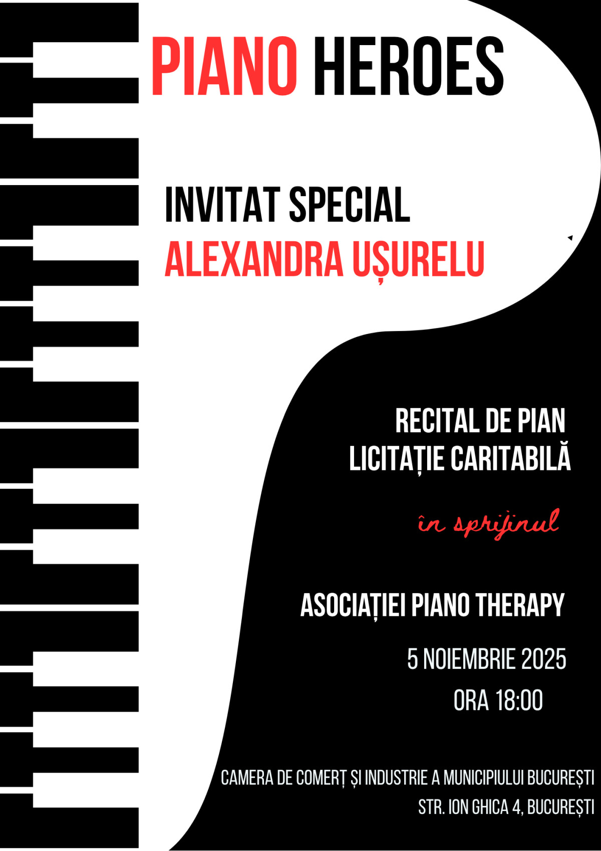Asociația Piano Therapy organizează pe 5 noiembrie 2025, la Camera de Comerț și Industrie a Municipiului București, evenimentul caritabil „Piano Heroes”, un recital de pian, urmat de o licitație caritabilă, în sprijinul copiilor diagnosticați cu autism. Invitata specială a ediției din acest an este Alexandra Ușurelu, una dintre cele mai sensibile și apreciate voci ale scenei muzicale românești, cunoscută pentru emoția profundă pe care o aduce pe scenă.