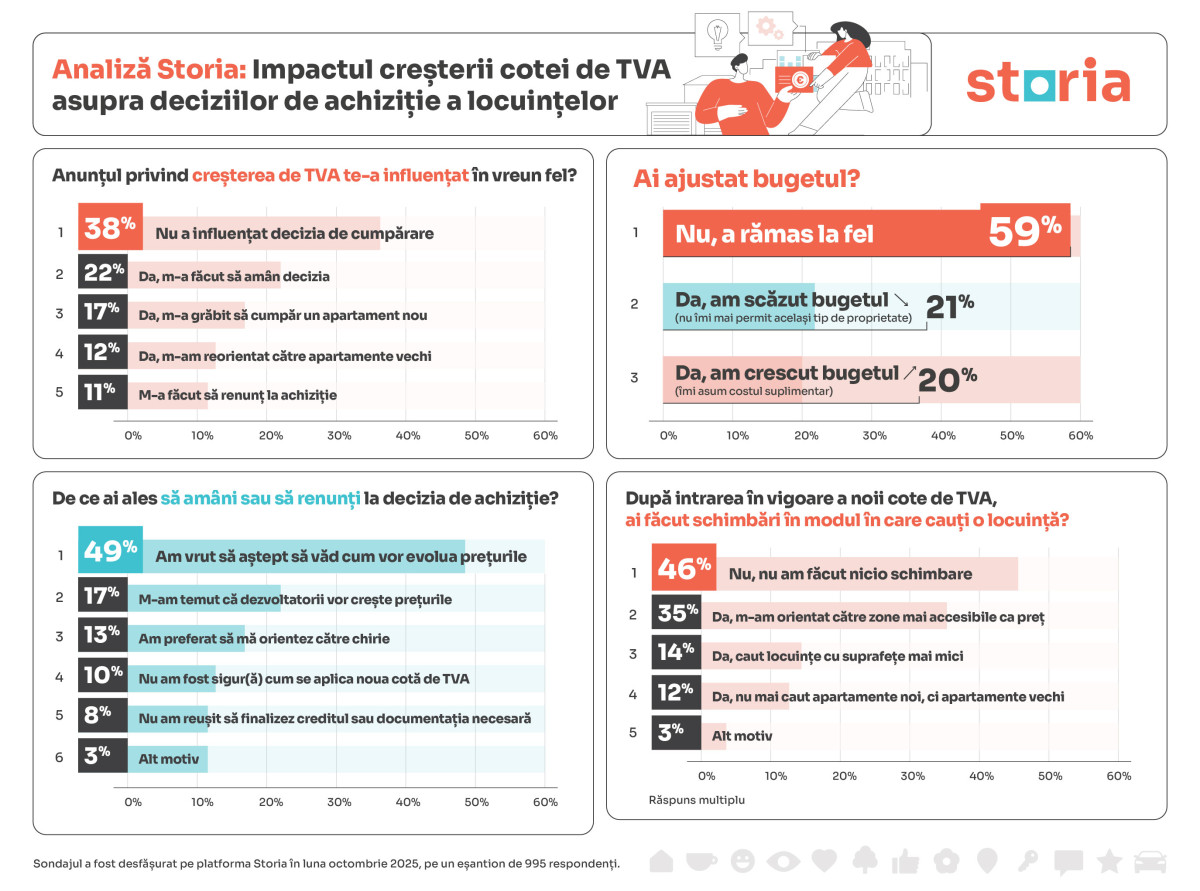 Schimbările fiscale anunțate pentru luna august au influențat deciziile celor care erau în procesul de căutare și achiziție. Astfel, 22% dintre cei aflați în căutarea unui apartament au ales să amâne achiziția, în timp ce 17% au declarat că s-au grăbit să finalizeze tranzacția pentru a putea beneficia – în funcție de valoarea locuinței și de condițiile legale – de una dintre cele două cote de TVA (9% sau 19%). Cel mai recent sondaj realizat de platforma imobiliară Storia, în octombrie 2025, s-a adresat persoanelor aflate în căutarea unei locuințe noi sau celor care nu erau încă decise cu privire la tipul de locuință pe care îl caută și care începuseră procesul de căutare înainte de iulie 2025. Întrebați dacă odată cu intrarea în vigoare a noii cote de TVA au făcut schimbări în modul în care caută o locuință, cei mai mulți dintre respondenți au menționat că nu au făcut nicio schimbare (46%). Totuși 35% au declarat că s-au orientat către zone mai accesibile ca preț, 14% caută locuințe cu suprafețe mai mici și 12% nu mai caută apartamente noi, ci vechi.