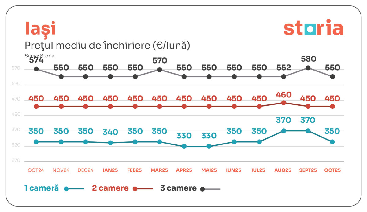 În Iași, prețul mediu de închiriere a fost de 350 euro la garsoniere (la același nivel cu anul trecut, -5% comparativ cu septembrie), 450 euro la două camere (similar cu luna trecuta și anul anterior) și 550 euro la trei camere (-4% față de anul trecut, -5% comparativ cu septembrie).