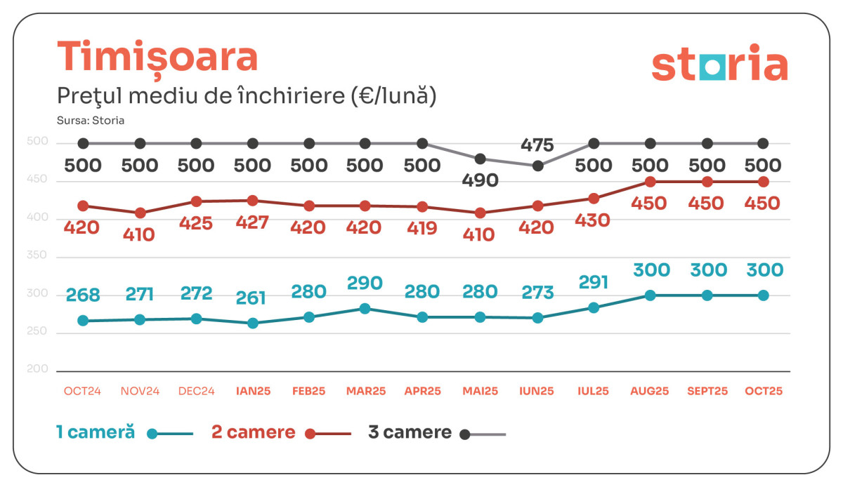 În Timișoara, prețul mediu de închiriere al garsonierelor a fost de 300 euro (+12% față de anul trecut), al apartamentelor cu două camere 450 euro (+7%), iar al celor cu trei camere 500 euro (nivel similar atât comparativ cu luna precedentă, cât și cu anul anterior). Toate segmentele s-au menținut stabile comparativ cu luna septembrie.