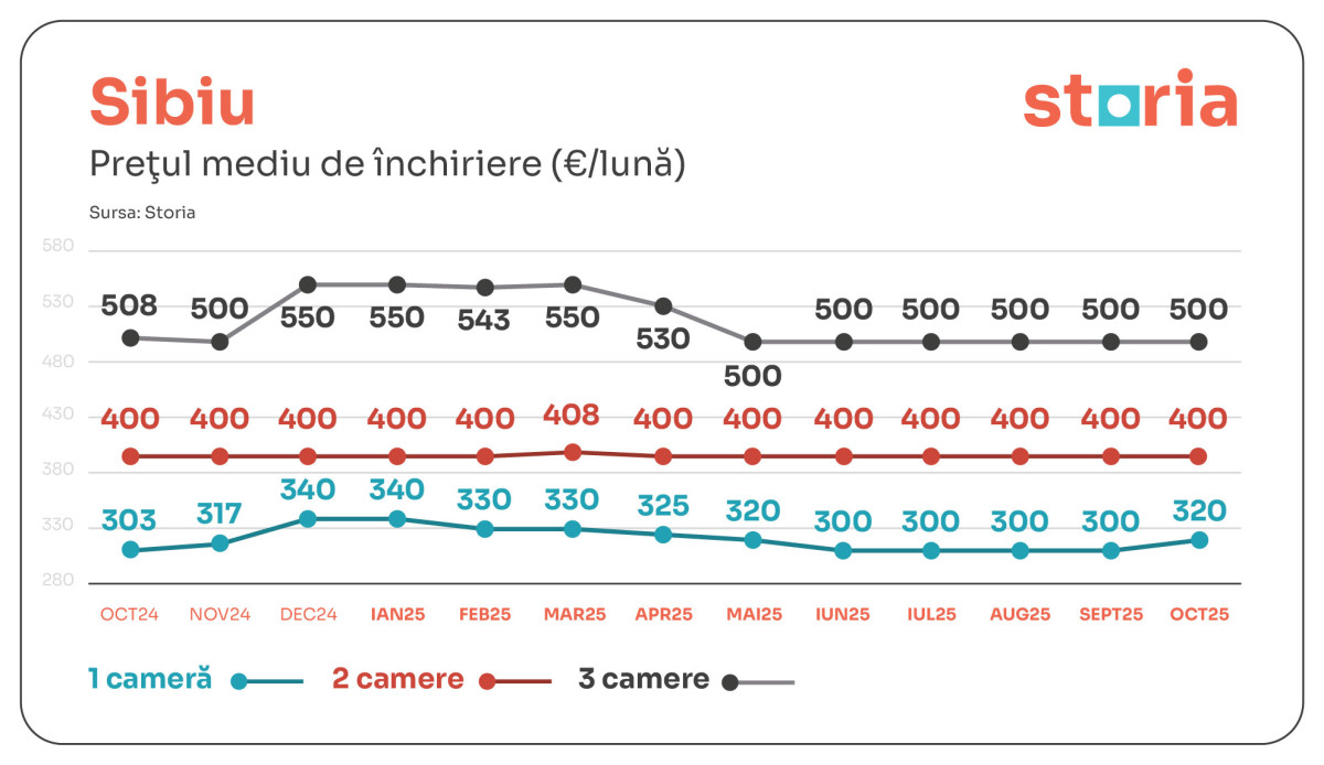 În Sibiu, prețul mediu de închiriere al garsonierelor a crescut cu 6% față de anul trecut, ajungând la 320 euro (+7% comparativ cu luna septembrie). Apartamentele cu două camere s-au menținut la 400 euro, iar cele cu trei camere la 500 euro (-2% față de anul trecut, fără variații lunare).