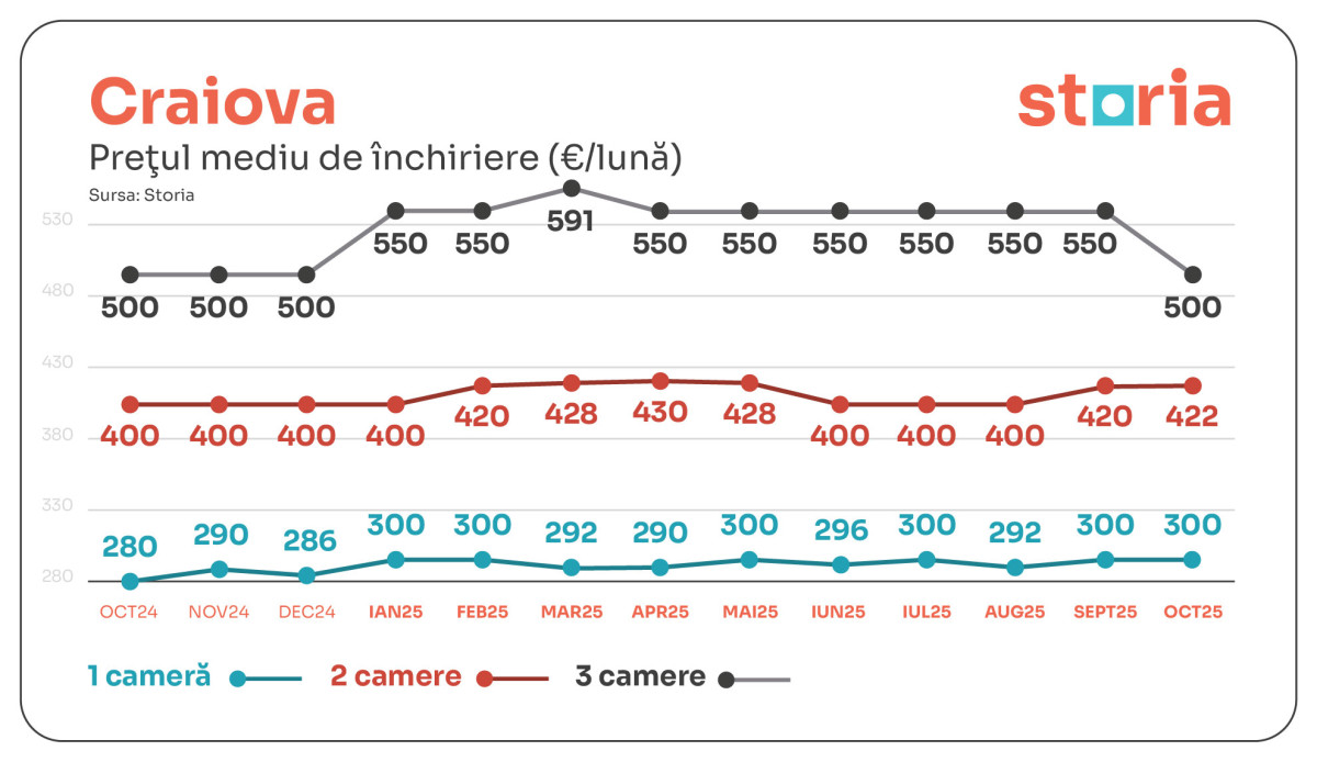 În Craiova, garsonierele s-au închiriat în medie cu 300 euro (+7% față de anul trecut), apartamentele cu două camere cu 422 euro (+5%), iar cele cu trei camere cu 500 euro (nivel similar cu 2024). Comparativ cu luna septembrie, chiriile au rămas stabile la garsoniere și două camere, iar prețul mediu al apartamentelor cu trei camere a scăzut cu 9%.