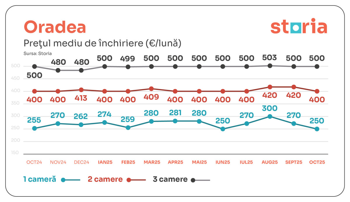 La Oradea, chiriile medii au fost de 250 euro la garsoniere (-2% față de anul trecut, -7% comparativ cu septembrie), 400 euro la două camere (-5% comparativ cu septembrie) și 500 euro la trei camere (fără variații lunare sau anuale).