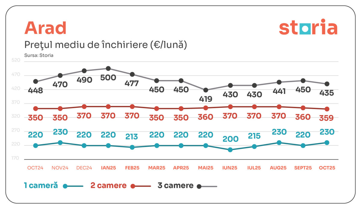 În octombrie, chiriile medii din Arad au fost de 230 euro pentru garsoniere, 359 euro pentru apartamentele cu două camere și 435 euro pentru trei camere. Față de anul trecut, prețul mediu de închiriere pentru garsoniere a fost cu 5% mai mare, la două camere cu 3% mai mare, iar la trei camere cu 3% mai mic. Comparativ cu luna septembrie, nivelurile s-au menținut apropiate, cu o creștere de 5% la garsoniere și o scădere ușoară de 3% la apartamentele cu trei camere.