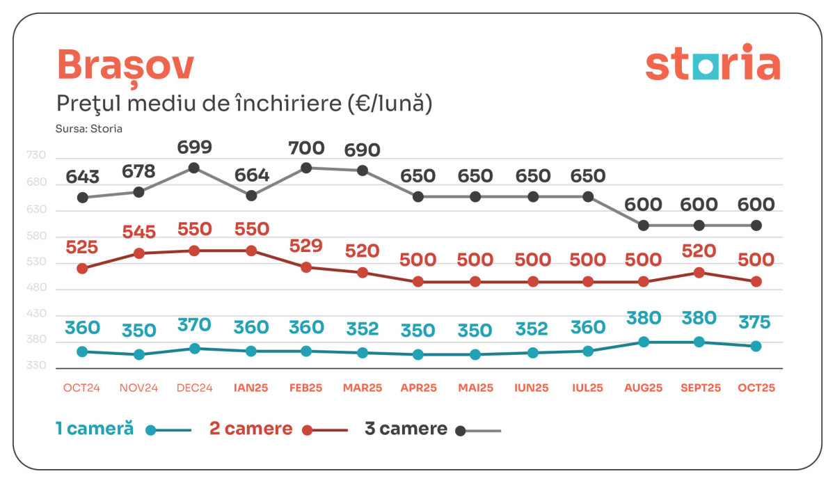 În Brașov, chiriile medii au fost de 375 euro la garsoniere (+4% față de anul trecut, -1% comparativ cu septembrie), 500 euro la două camere (-5% față de anul trecut, -4% comparativ cu luna anterioară) și 600 euro la trei camere (-7% față de 2024, stabile comparativ cu septembrie). Datele arată o scădere ușoară a chiriilor față de anul trecut, mai vizibilă la apartamentele cu două și trei camere.