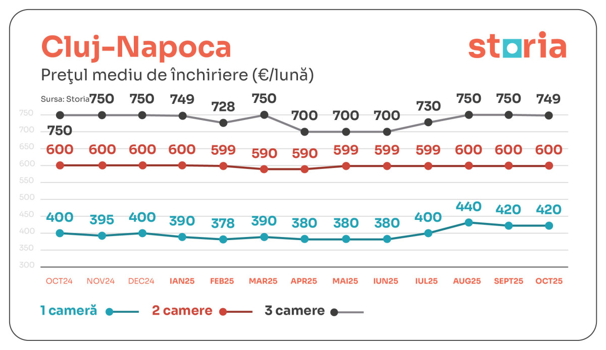 În Cluj-Napoca, chiriile medii au fost de 420 euro la garsoniere (+5% față de anul trecut), 600 euro la două camere și 749 euro la trei camere (ambele la același nivel ca în 2024). Comparativ cu luna septembrie, toate segmentele s-au menținut stabile.