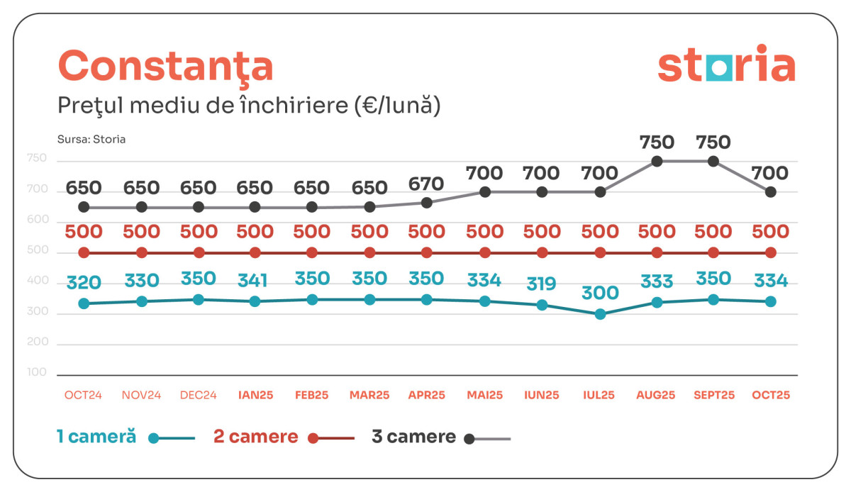 În Constanța, garsonierele au ajuns la 334 euro (+4% față de anul trecut, -5% comparativ cu septembrie), apartamentele cu două camere la 500 euro (nivel constant), iar cele cu trei camere la 700 euro, unde prețul mediu de închiriere a crescut cu 8% față de 2024, dar a înregistrat o ajustare lunară de -7%.