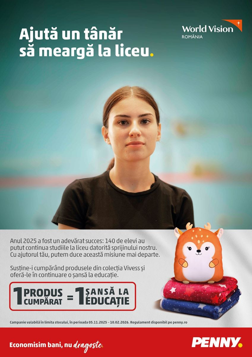 „Suntem recunoscători clienților noștri pentru implicarea constantă care ne-a permis, în 2025, să continuăm susținerea celor 140 de elevi din mediul rural în studiile lor la liceu. Prin noua campanie, ne dorim să ducem mai departe această misiune și să demonstrăm că fiecare alegere făcută la PENNY poate aduce căldură în case și în inimile celor care au nevoie de sprijin.”, a afirmat Monica Coman, Team Leader Advertising, PENNY | REWE România.