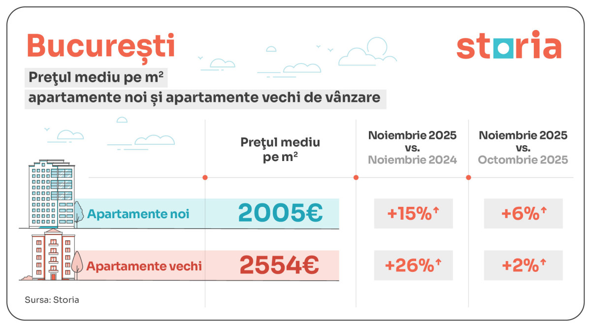 Capitala înregistrează cele mai mari diferențe între apartamentele vechi și cele noi. În noiembrie, prețul mediu solicitat a fost de 2.005 euro/mp pentru apartamentele noi, cu 15% mai mult decât anul trecut și 6% peste nivelul din octombrie, și de 2.554 euro/mp pentru cele vechi, în creștere cu 26% față de anul trecut și cu 2% față de luna anterioară, respectiv octombrie 2025.