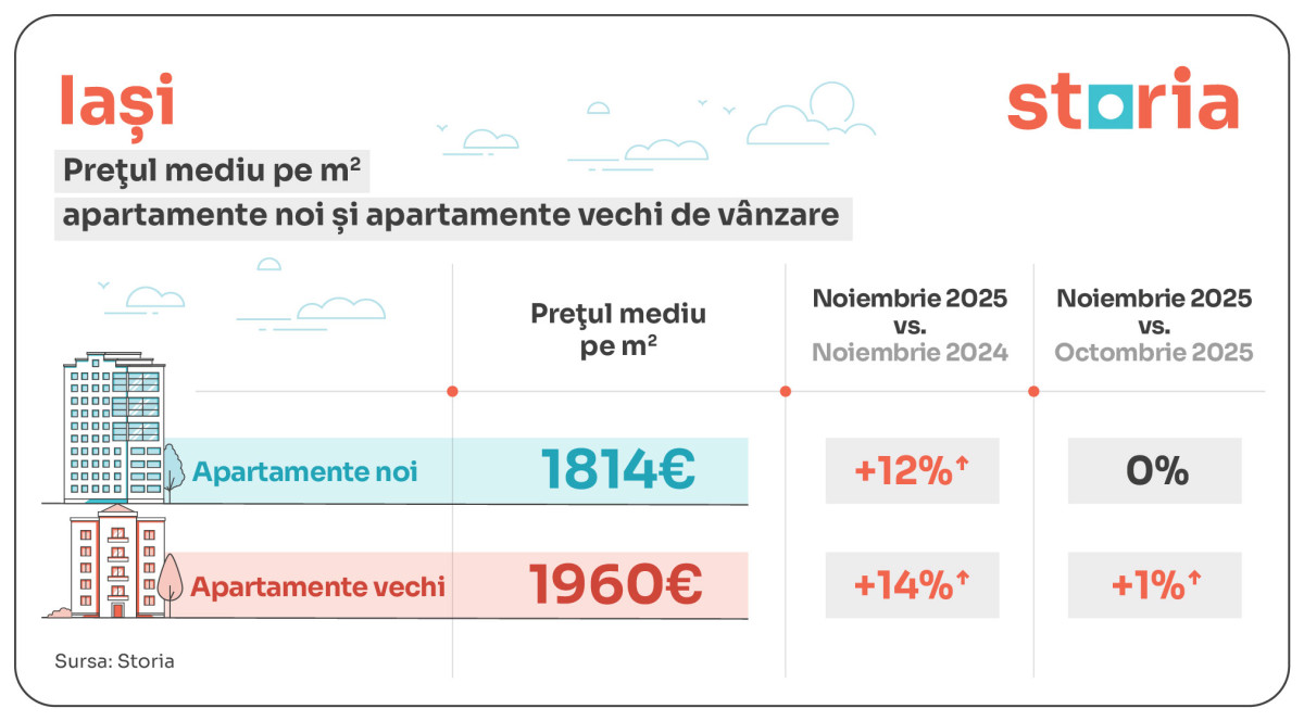 În Iași, prețul mediu solicitat a fost de 1.814 euro/mp pentru apartamentele noi, cu 12% mai mult decât anul trecut și similar cu luna octombrie, și 1.960 euro/mp pentru cele vechi, în creștere cu 14% față de anul trecut și 1% față de luna anterioară.