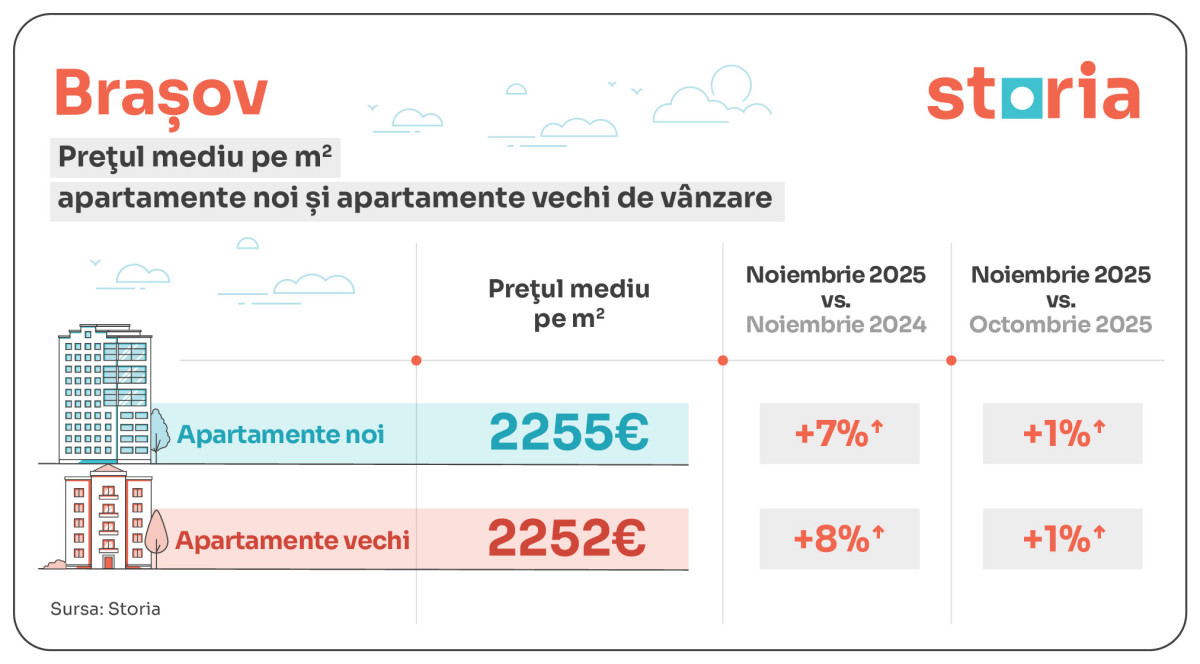 În Brașov, prețul mediu solicitat a fost de 2.255 euro/mp pentru apartamentele noi, cu 7% mai mult decât anul trecut și 1% peste nivelul din octombrie. În cazul apartamentelor vechi, prețurile au fost de 2.252 euro/mp, în creștere cu 8% față de anul trecut și 1% față de luna anterioară. Diferențele sunt minime între cele două categorii, de doar 3 euro.